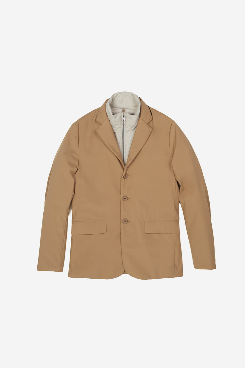 Giacca in nylon imbottita con pettorina staccabile, chiusura a tre bottoni quattro fori, due tasche con pattina.