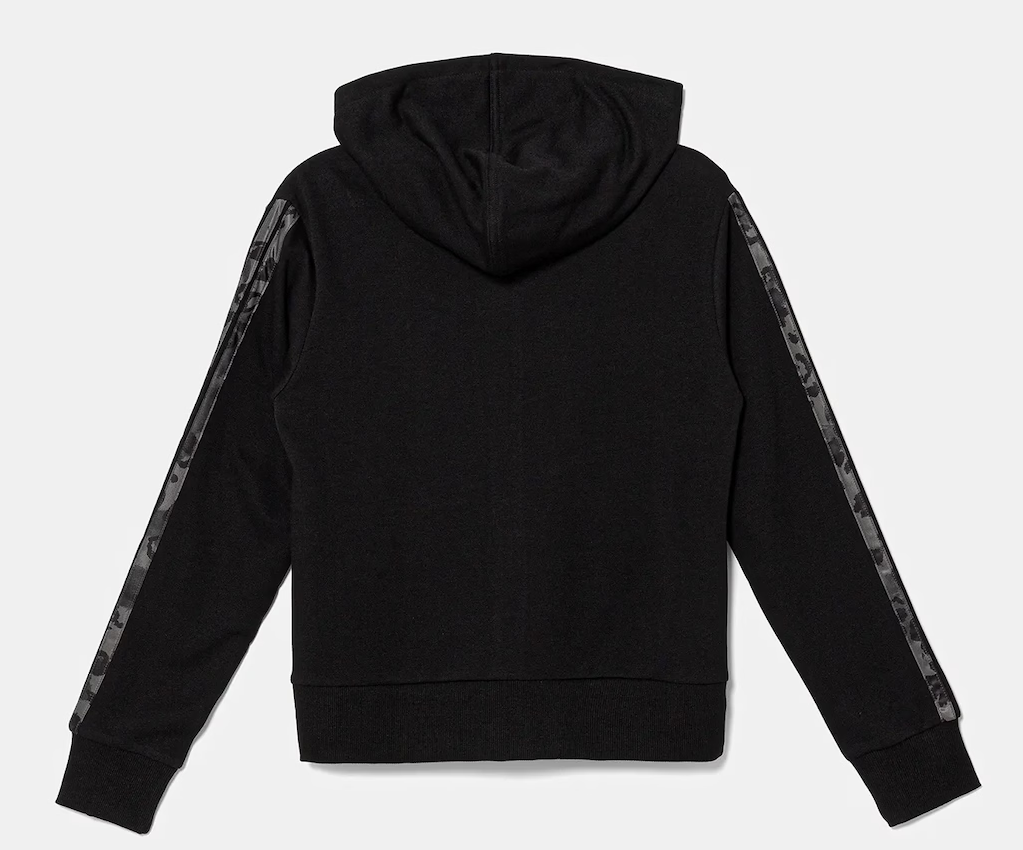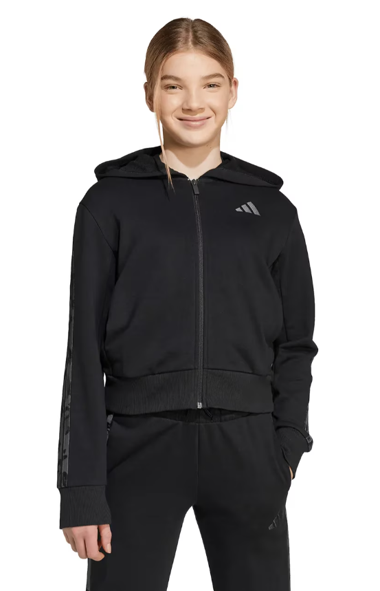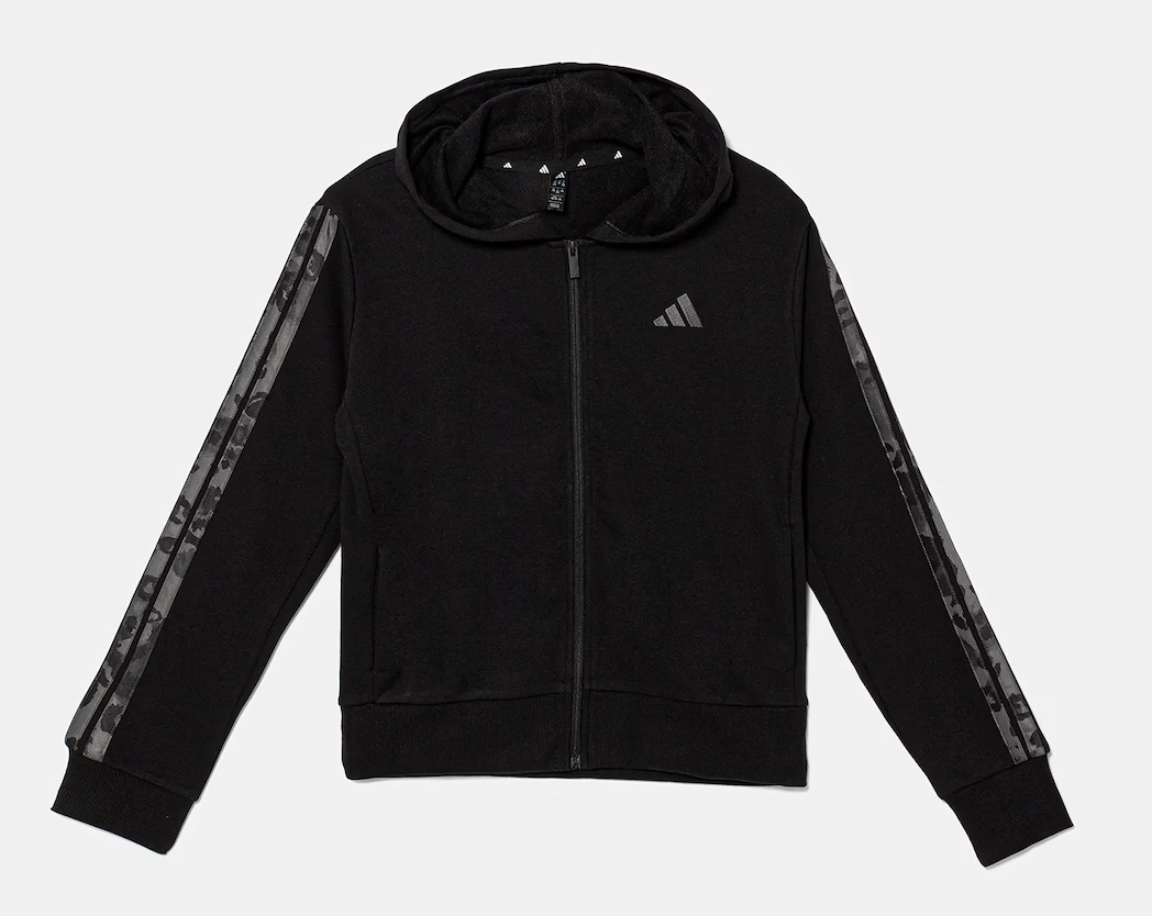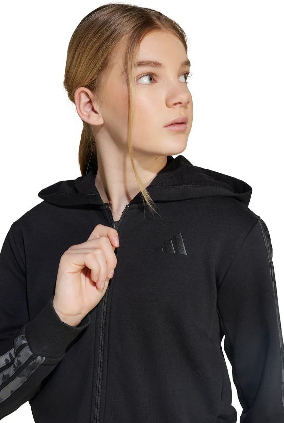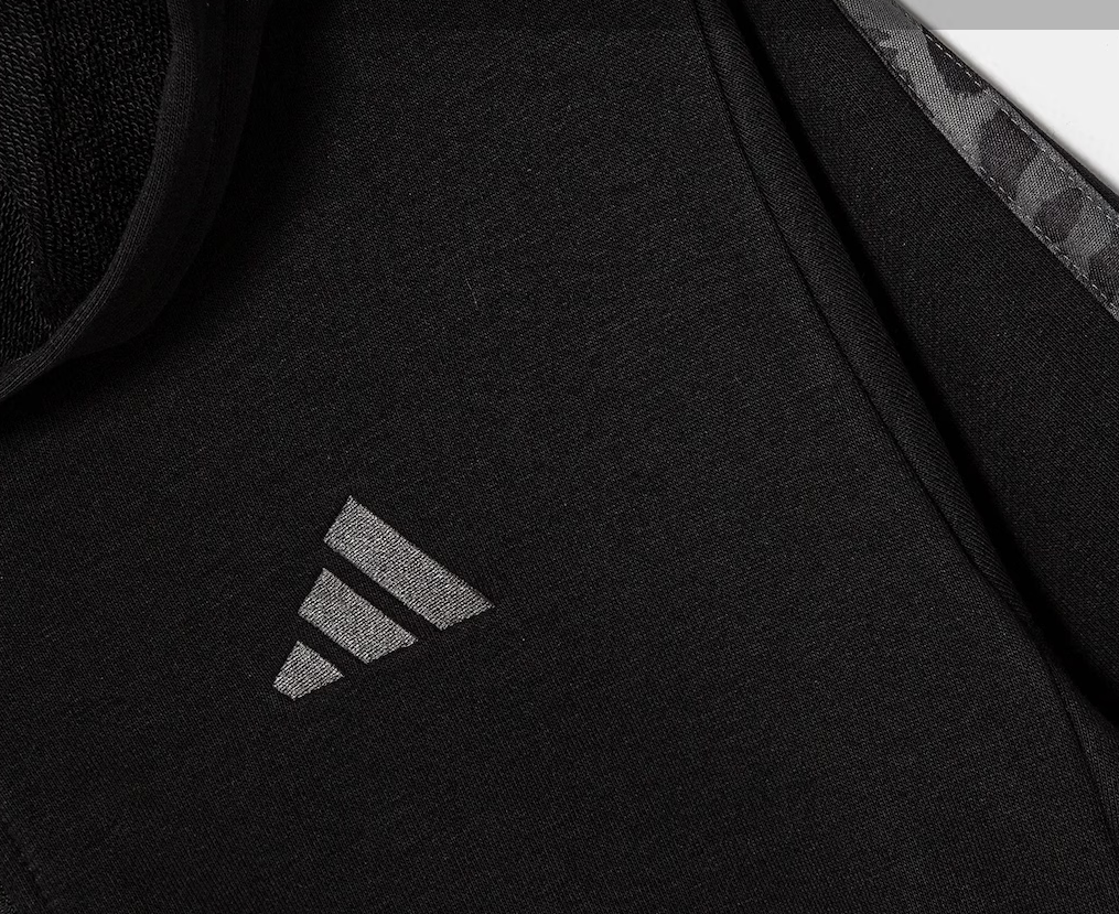 Adidas felpa con cappuccio per bambini. Modello realizzato in maglia con applicazioni. Il modello realizzato in un tessuto estremamente confortevole ad alta percentuale di cotone.