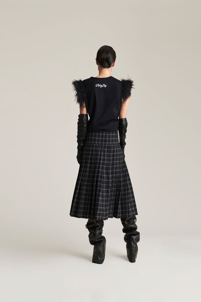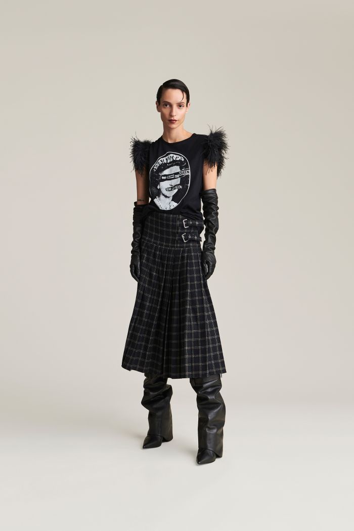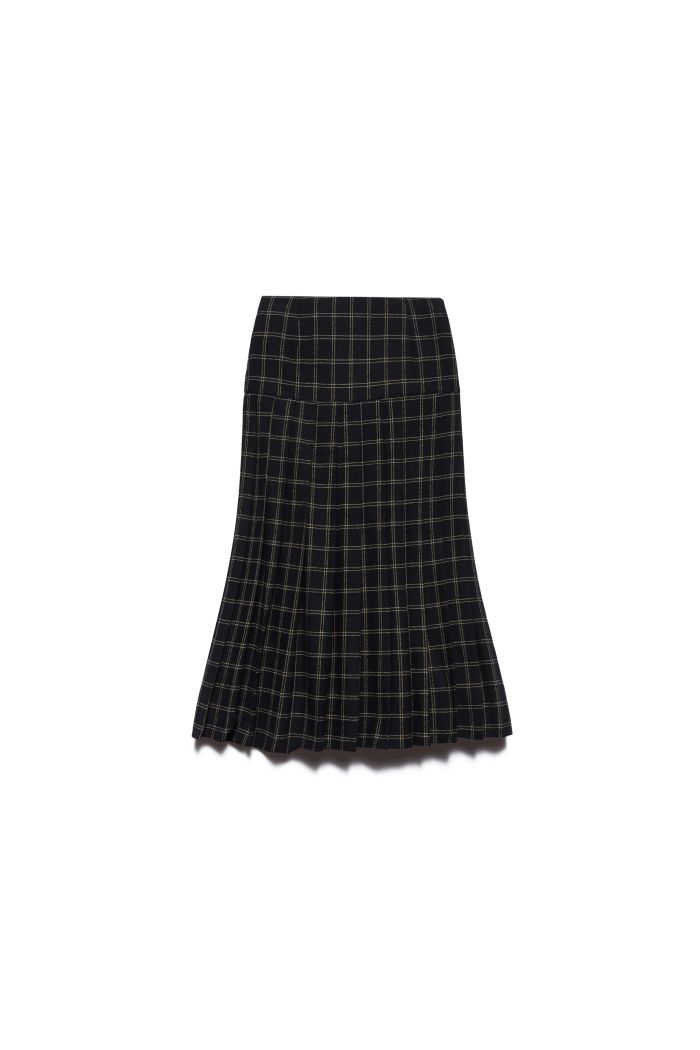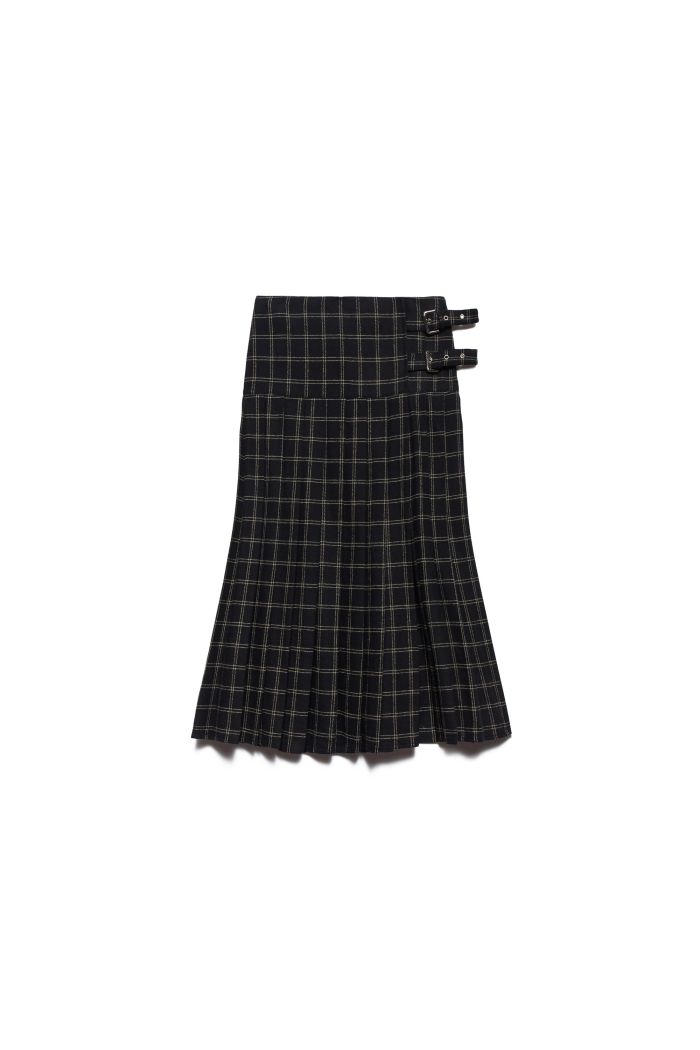 La gonna Gwen gioca con le ispirazioni school girl in chiave contemporanea. Realizzata in flanella di misto cotone, presenta un motivo check all over e un design a plissé che crea movimento e struttura. I cinturini laterali con fibbie regolabili aggiungono un tocco utility e grintoso al design.