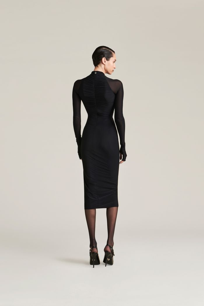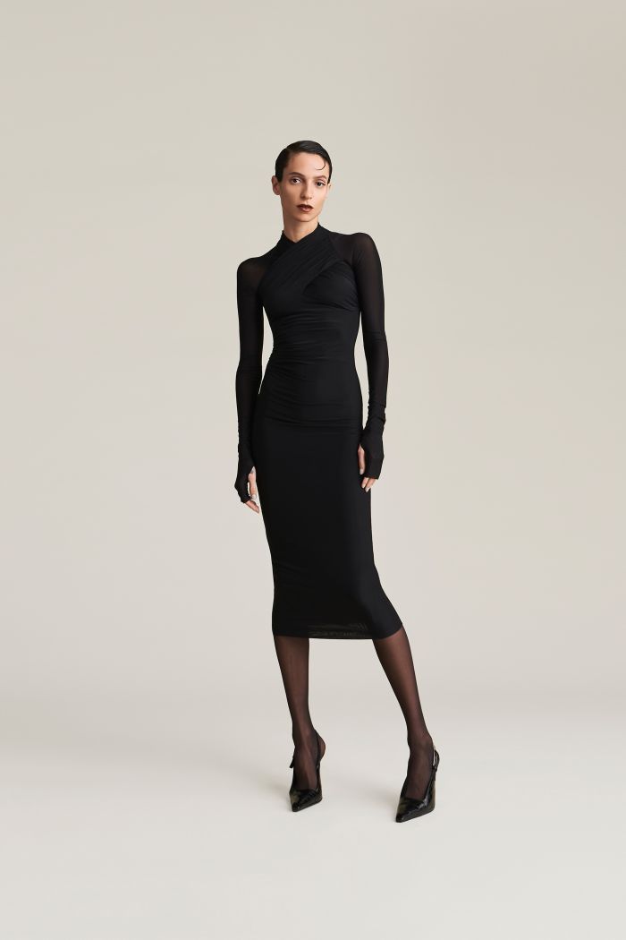 Perfetto per dominare la scena con grazia tagliente, l'abito midi a maniche lunghe Scandal si distingue per lo scollo incrociato che disegna il busto con tensione scenica. Un dettaglio amplificato dal drappeggio che si muove attorno al corpo.
