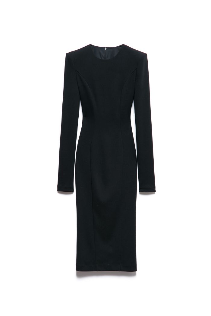 L’abito Sienna si affida alla forza delle linee essenziali per lasciare il segno. Il girocollo e le maniche lunghe costruiscono una silhouette sobria e decisa, mentre lo spacco posteriore introduce un accenno calibrato di movimento e sensualità.