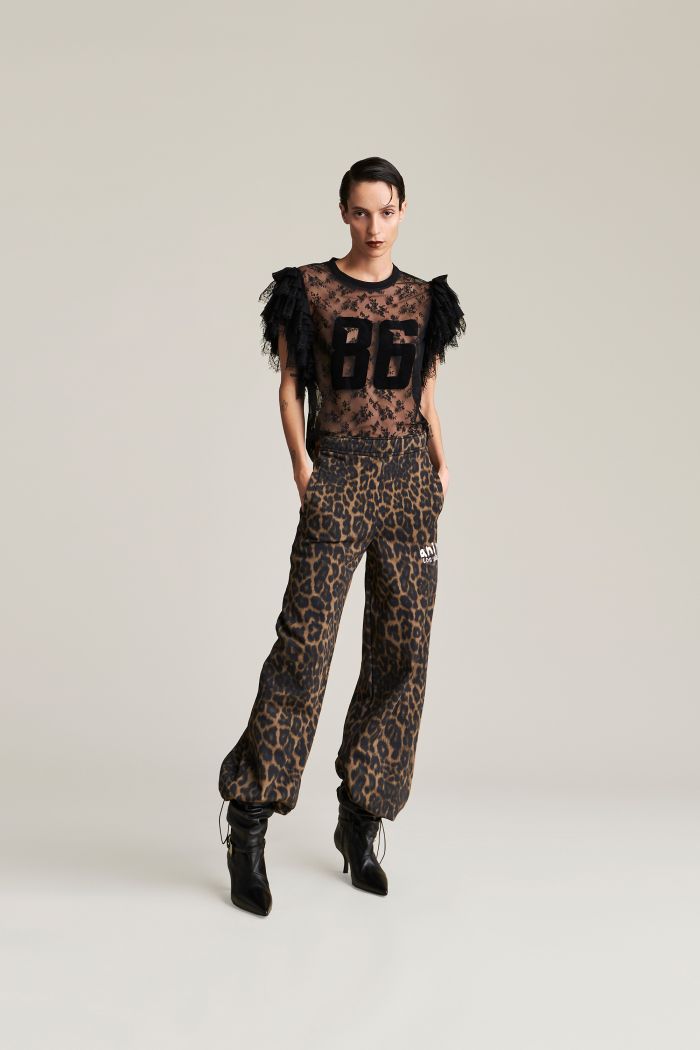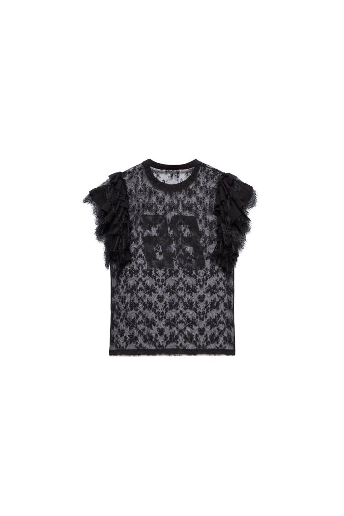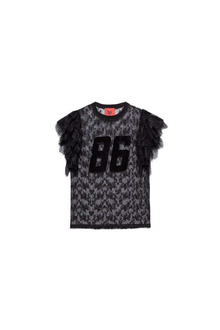 Un po' sporty, un po' dark. La t-shirt Aniye mescola il pizzo floreale see-through a ruches drammatiche sulle spalle. Il maxi numero stampato flock sul davanti reinterpreta l'ispirazione varsity in chiave glam.