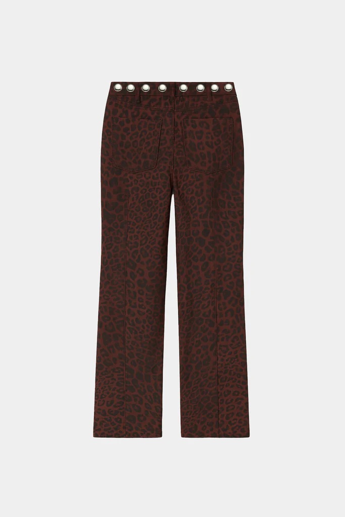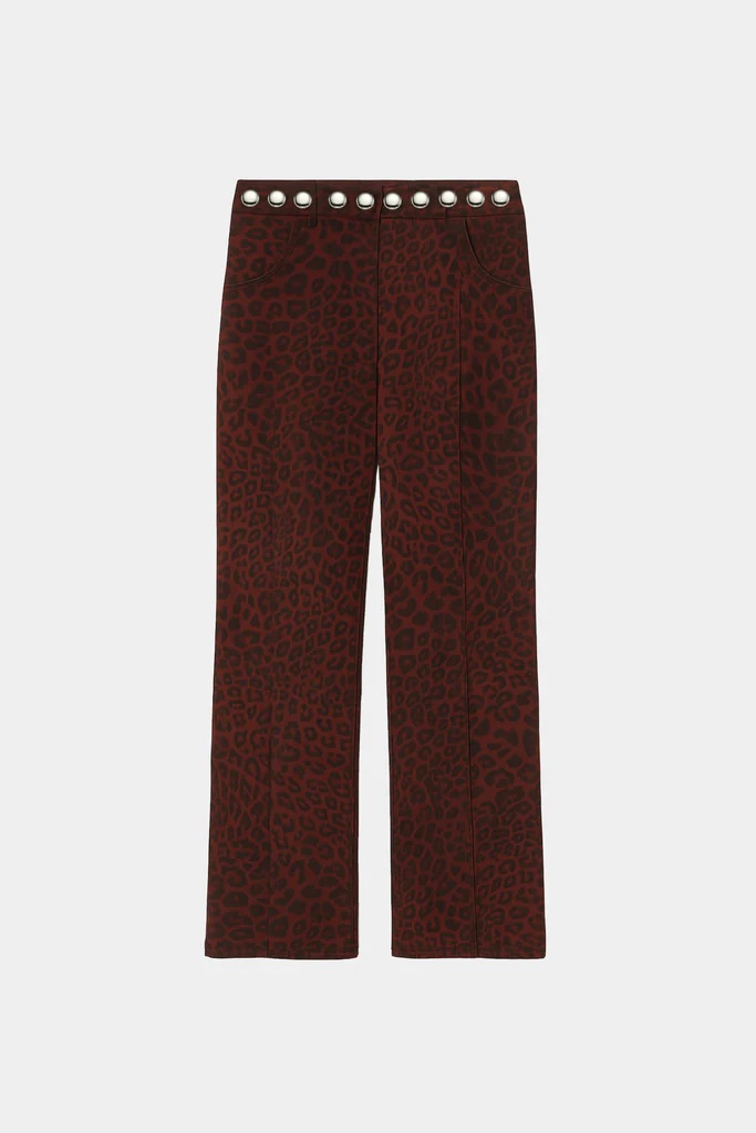 Pantaloni dritti in tessuto stampato animalier maculato. Caratterizzati da vita con passanti decorati da maxi borchie tonde in metallo. Presentano tasche laterali alla francese e tasche posteriori applicate. Chiusura frontale con bottone e zip. Linea dal fit moderno e deciso.