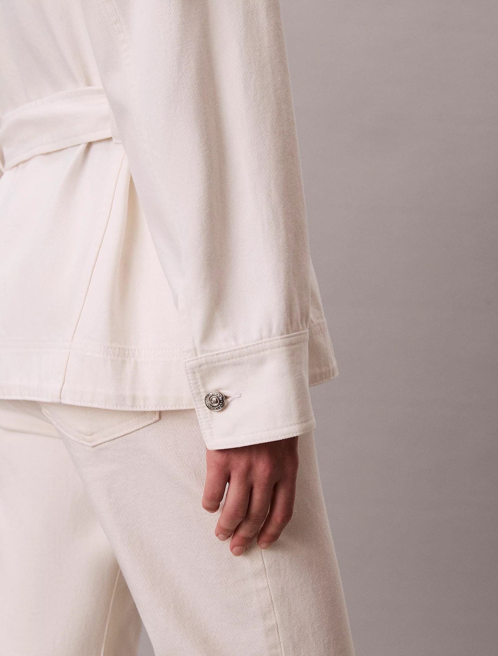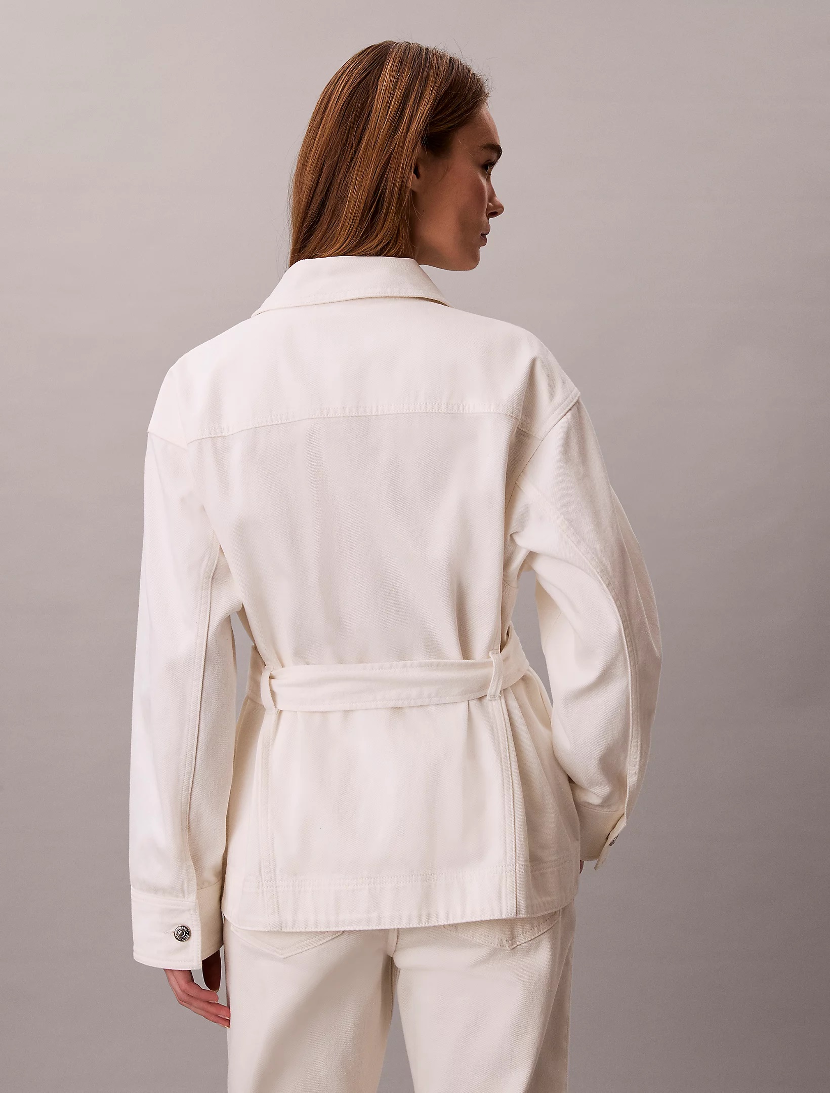 La nostra giacca iconica in denim bianco brillante, rivisitata con vita stretta e cintura da annodare per una vestibilità femminile.