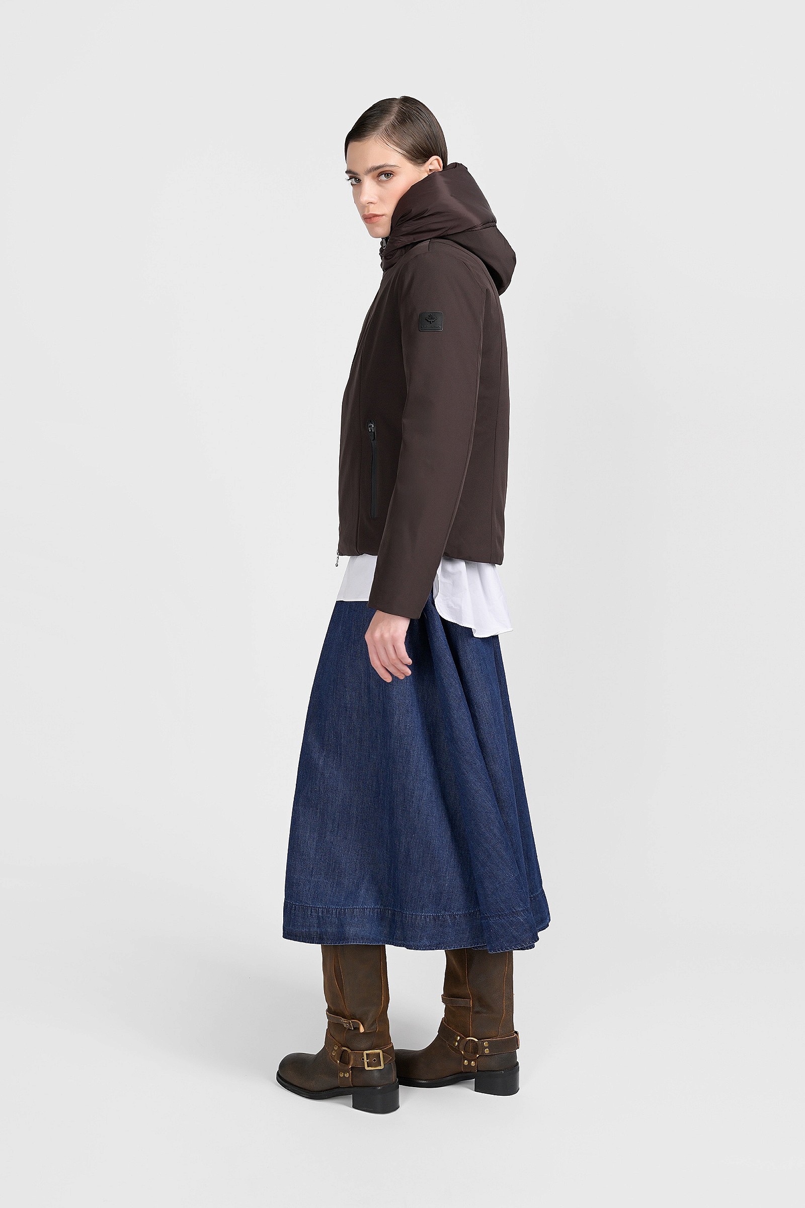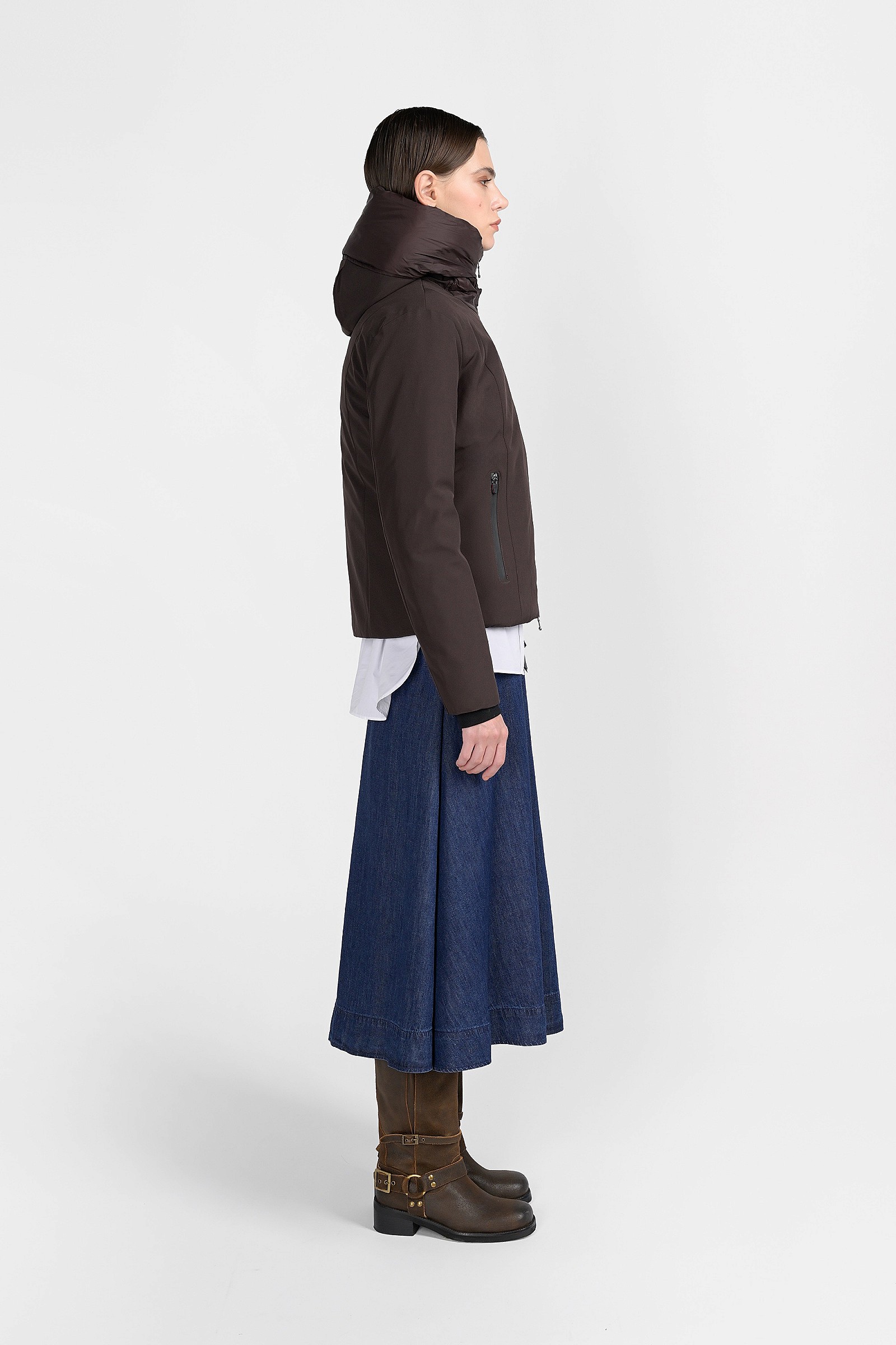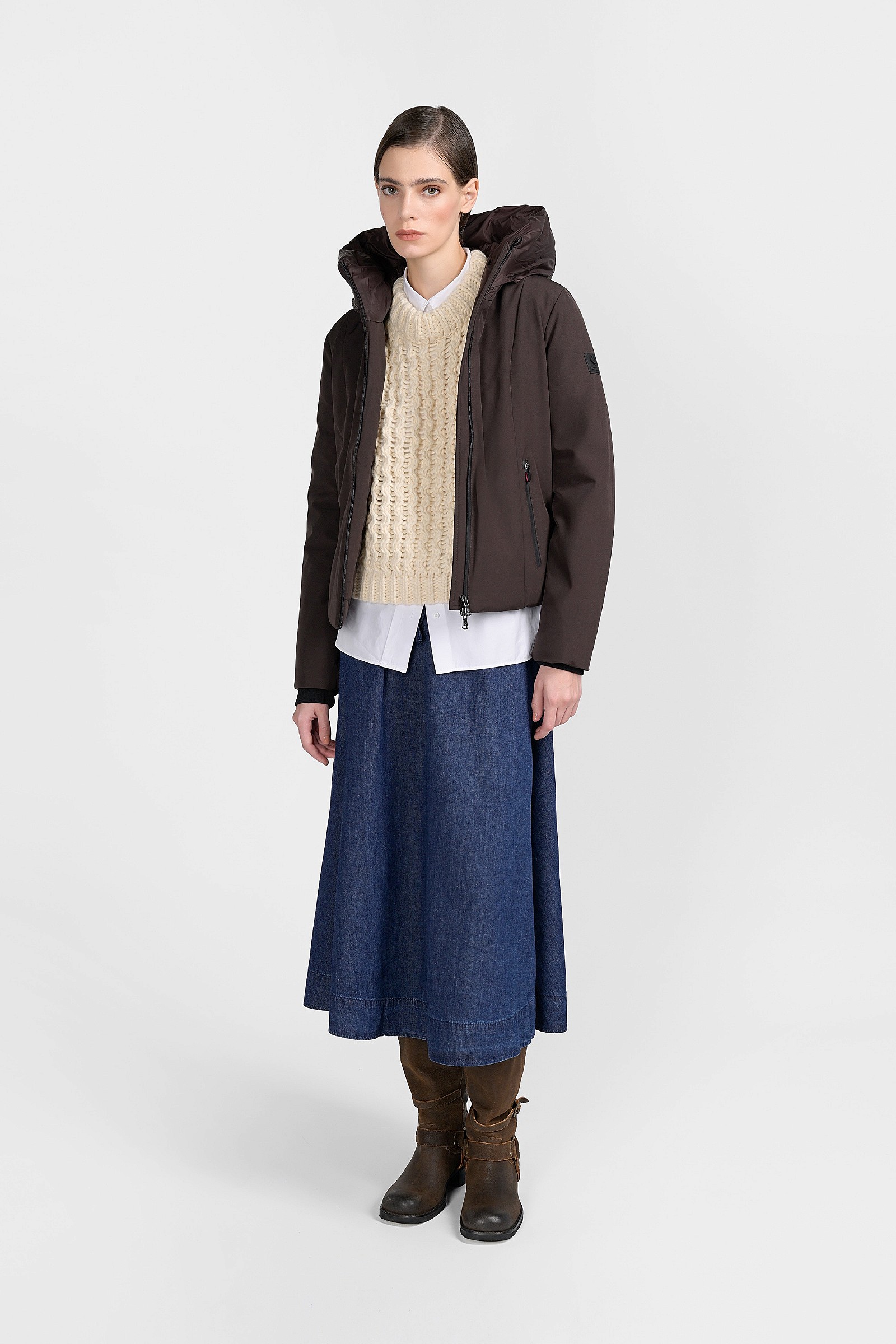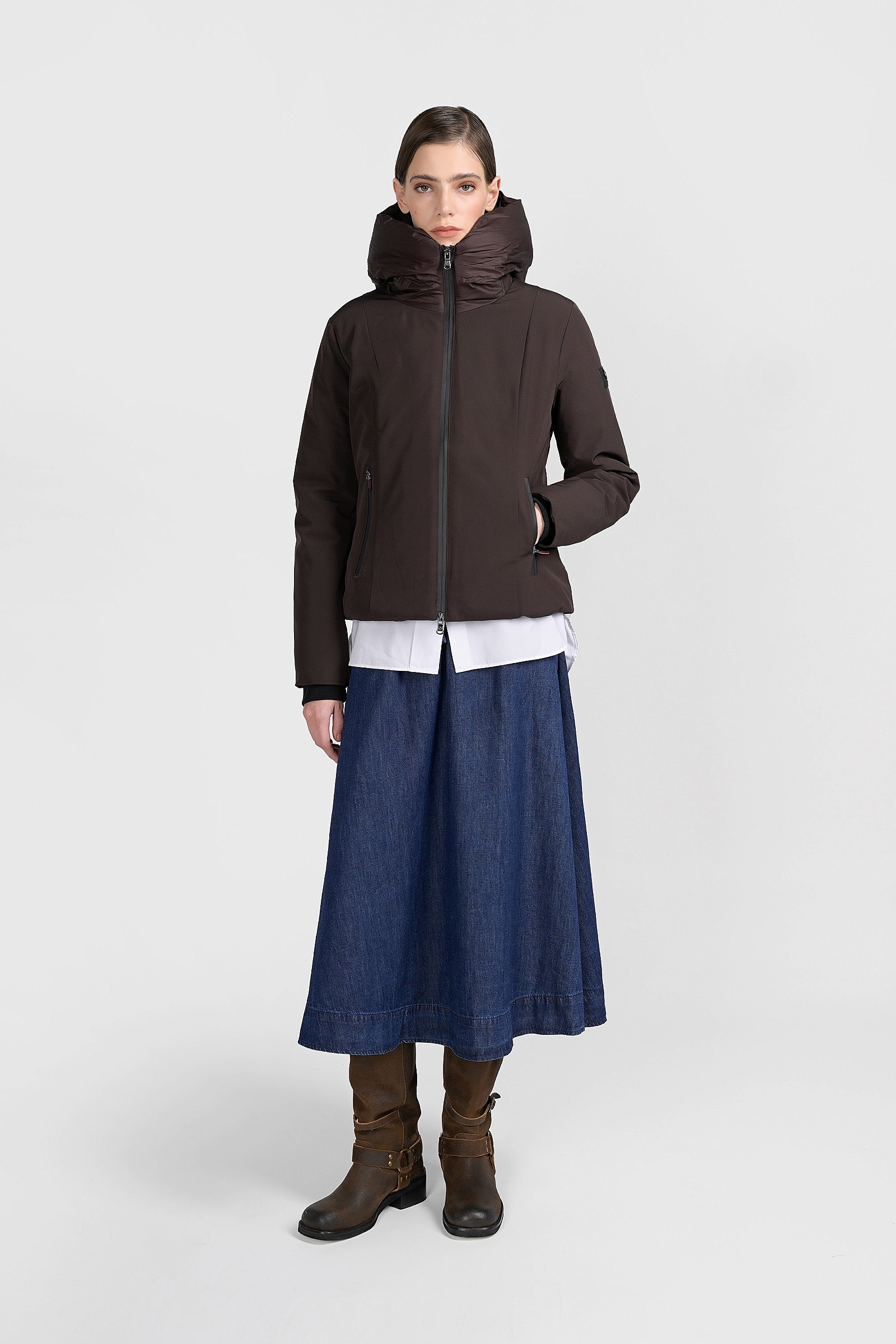 Questa giacca leggermente avvitata, con cappuccio fisso è realizzata interamente in poliestere, con una piccola percentuale di elastane per rendere più confortevoli i movimenti anche quando la si indossa sopra un maglione pesante. Il collo ad imbuto offre un'ulteriore protezione, come i polsini interni di maglia. Non è solo un capo casual, da indossare nei weekend o in montagna, vi tornerà utile anche nelle serate invernali, abbinata a look più eleganti, una gonna lunga di tessuto lucido o dei pantaloni fluidi.