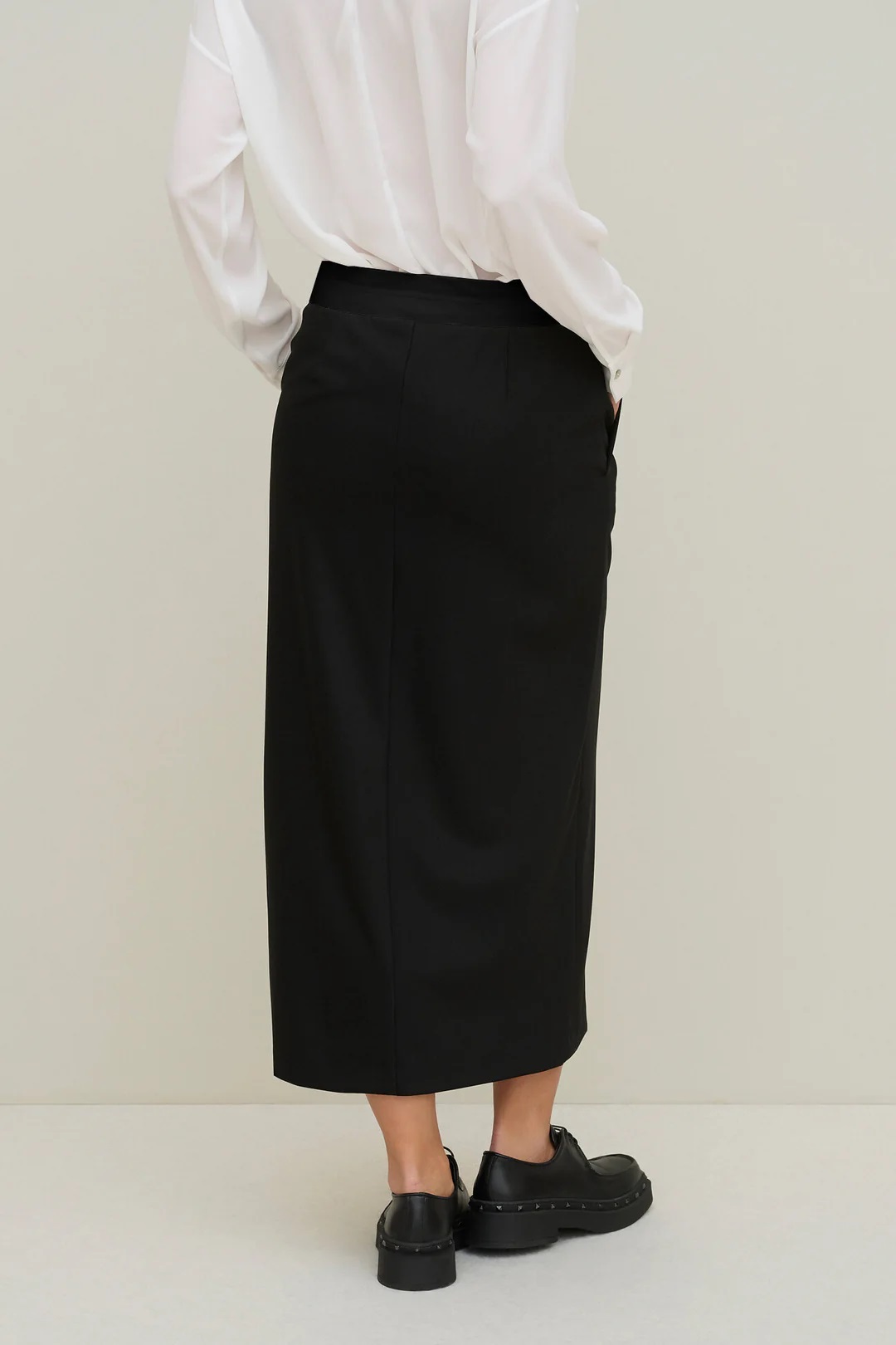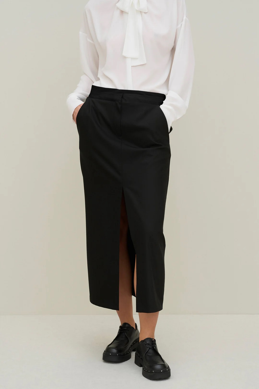 Gonna in gabardina elasticizzata con vita a fascia, chiusura a gancetto frontale e lampo nascosta. Tasche alla francese e ampio spacco baciato frontale. Linea aderente, capo sfoderato. Lunghezza sotto al ginocchio.