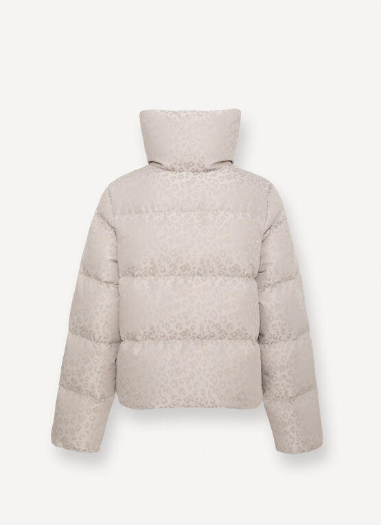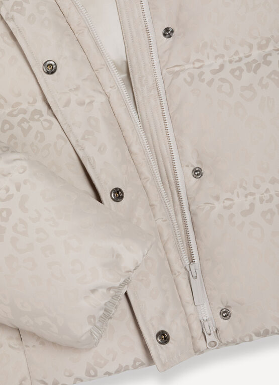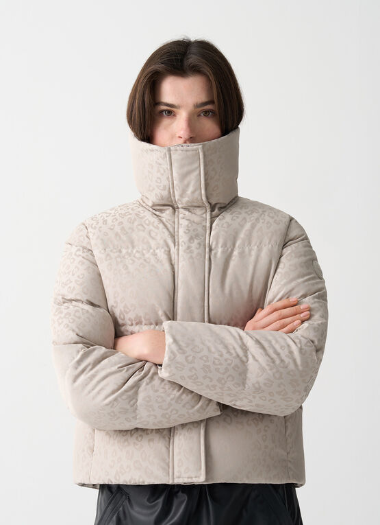 Il motivo all over animalier sui toni del piumino, con finish alternato lucido e opaco, conferisce al capo un carattere deciso. Il collo, alto e ampio, offre protezione quando chiuso e un look più morbido e rilassato quando rovesciato. Le tasche laterali completano il design, garantendo comfort e stile.