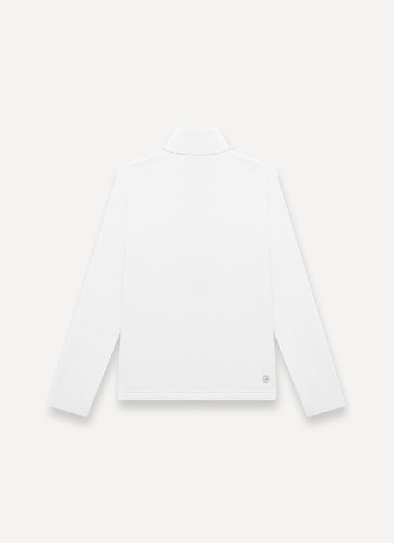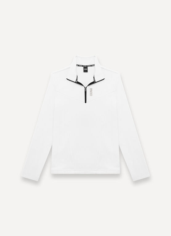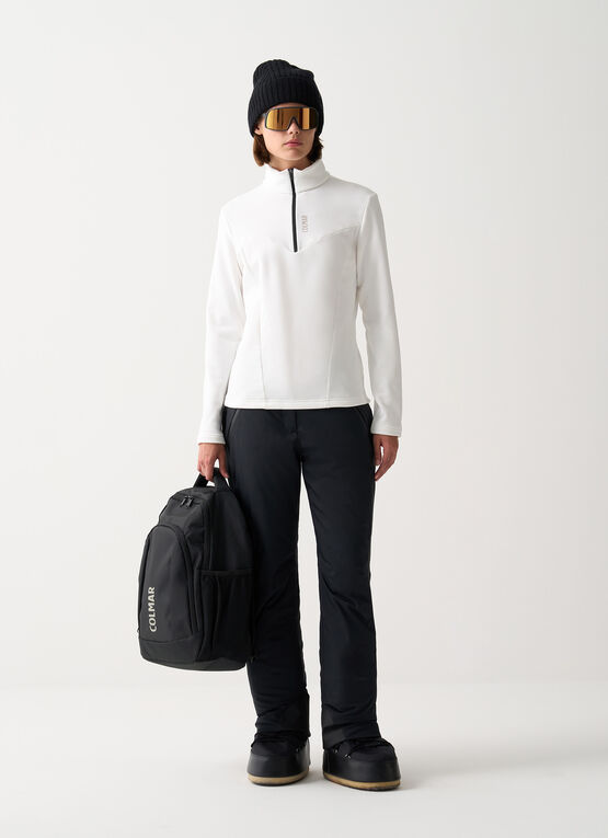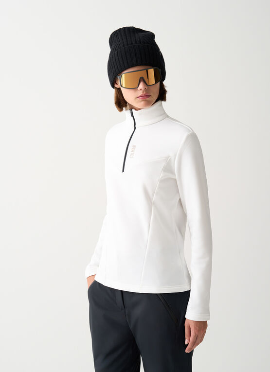 In morbido pile stretch, la felpa termica da sci donna con mezza zip unisce comfort e funzionalità in un capo tecnico e pratico.