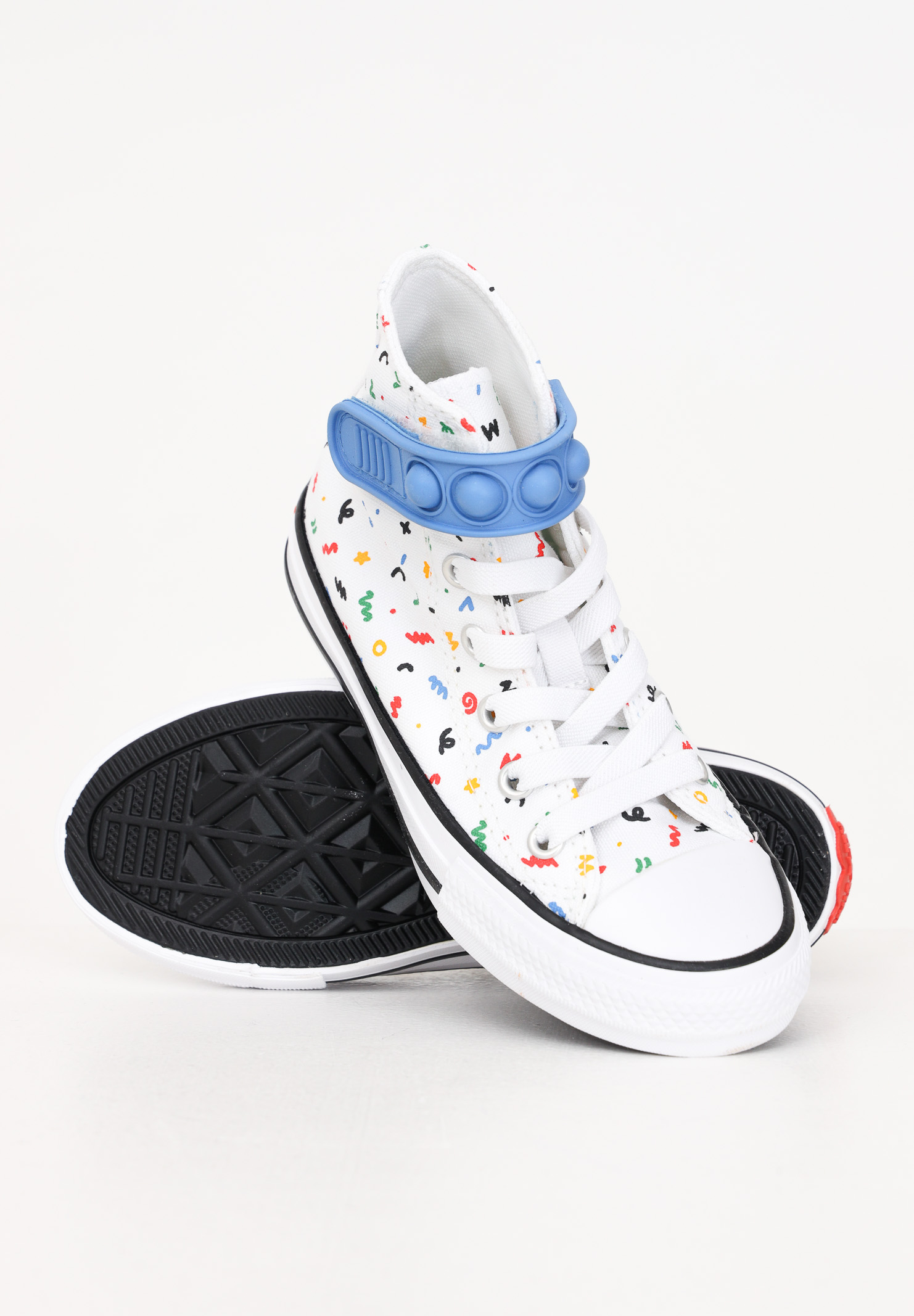 Sneakers bambino bambina bianche con fantasia coriandoli multicolor chiusura strappo pop it CTAS BUBBLE STRAP. Sneakers con tomaia in tessuto e dettagli a contrasto. Presenta sottopiede in tessuto e fondo in gomma. Patch logo laterali. Chiusura con lacci. Calzata regolare.