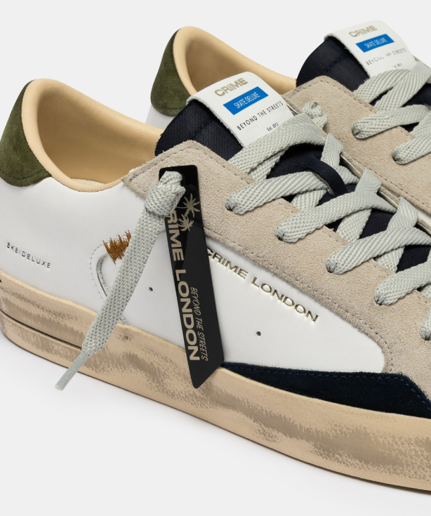 Tomaia in pelle bianca, dettagli in suede blu notte