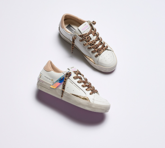 Tomaia in pelle bianca, dettagli in lamina platino