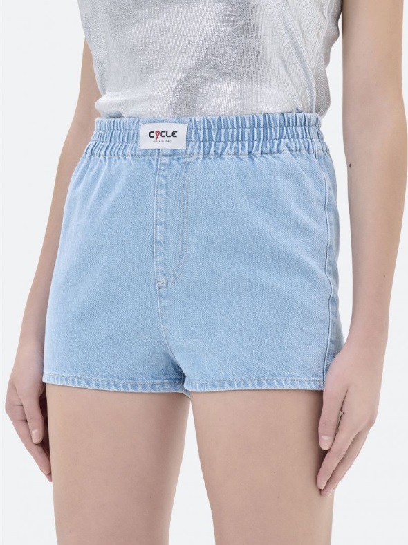 Shorts con vita alta elasticizzata. Questo capo, proposto in una tonalità sky blue con lavaggio candeggiato, è realizzato in puro cotone e cotone riciclato: una scelta che testimonia l'impegno di Cycle per una moda più sostenibile e che ha valso al brand la certificazione RCS (Recycled Claim Standard). Il design dalle linee essenziali è completato da un'etichetta frontale con il lettering Cycle per un tocco personalizzato.
