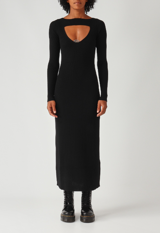 Abito midi in lana a maniche lunghe con vestibilità regular e silhouette avvolgente. Realizzato con lavorazione a costine 2x2 su tutta la superficie, è caratterizzato da un intarsio a triangolo sulla scollatura. Il logo Oval D si trova all'angolo inferiore del cut-out, aggiungendo un elemento distintivo.