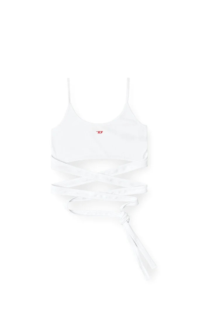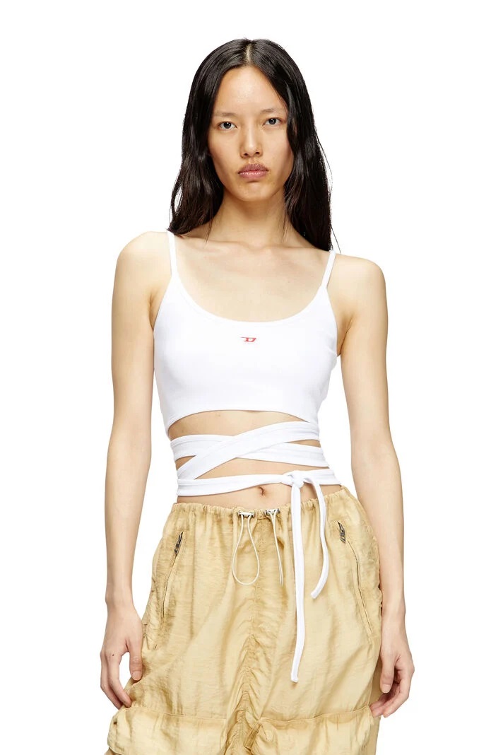 Top senza maniche da donna realizzato in cotone biologico stretch per una vestibilità aderente. L'orlo del top è diviso in due fasce che si incrociano sul corpo e si legano con un nodo. Rifinito con una piccola patch D ricamata sul petto.