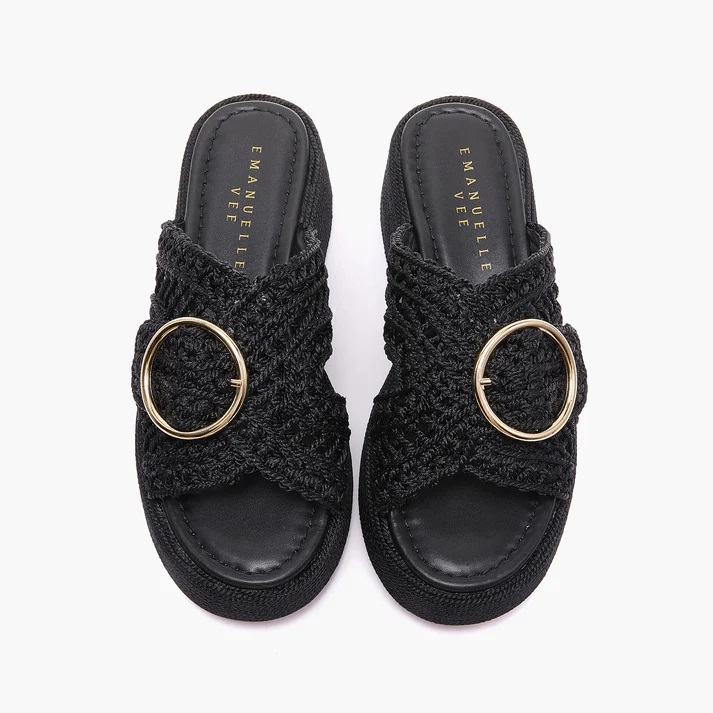 Mules in raffia sutage con fibbia, zeppa in raffia 60mm