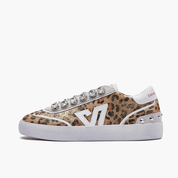 Sneaker a cassetta in cavallino texture leopard, dettaglio strass nell'allacciatura e suola in gomma
