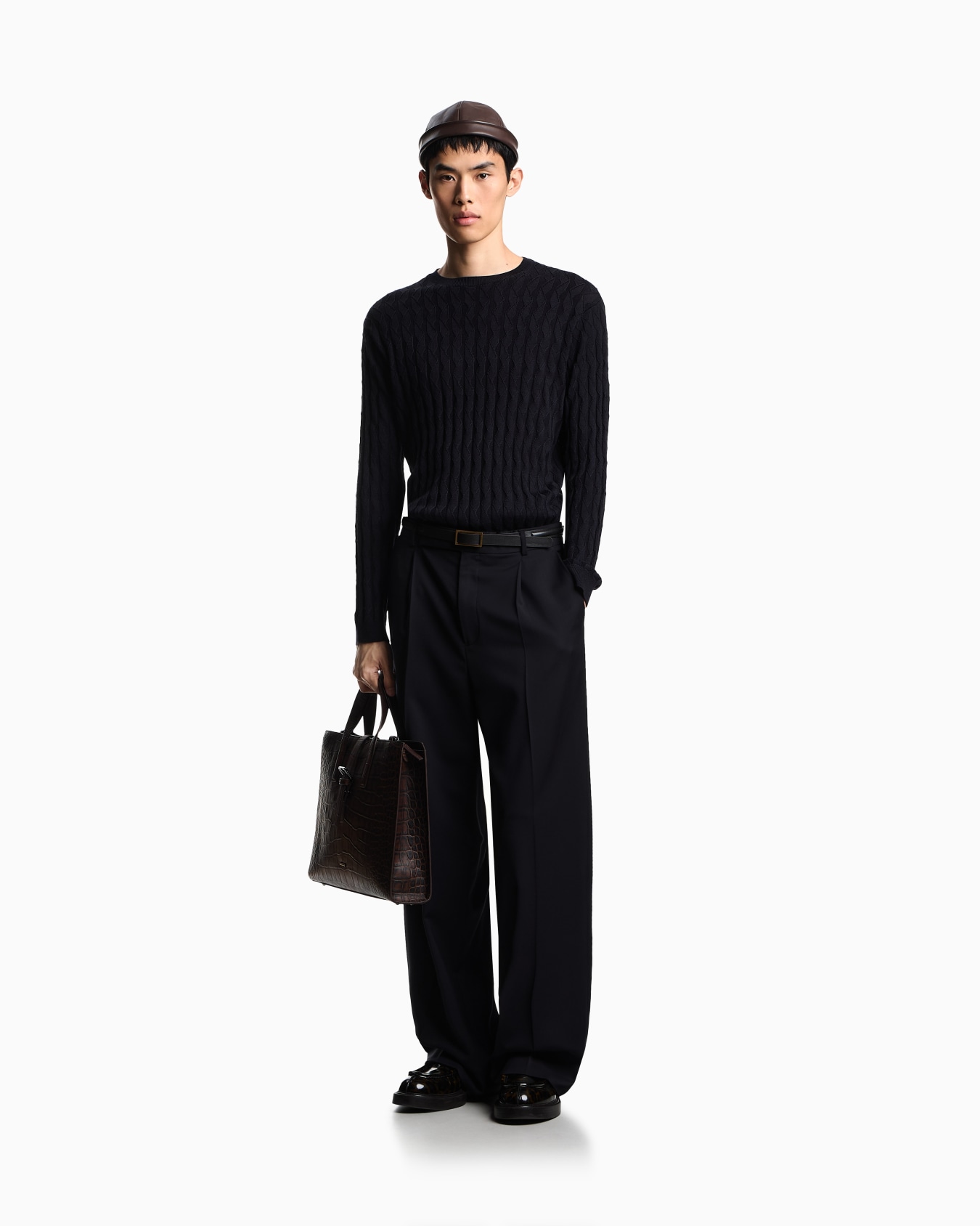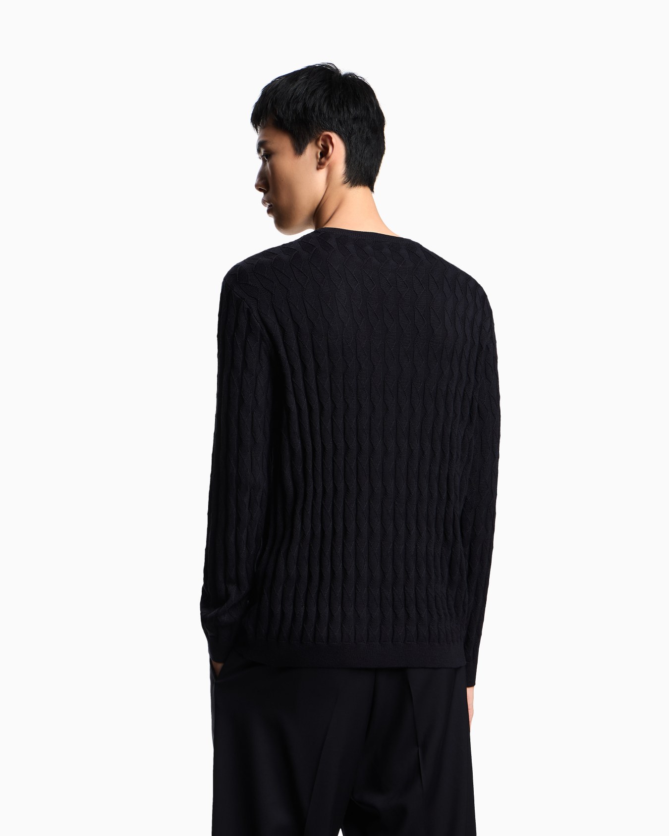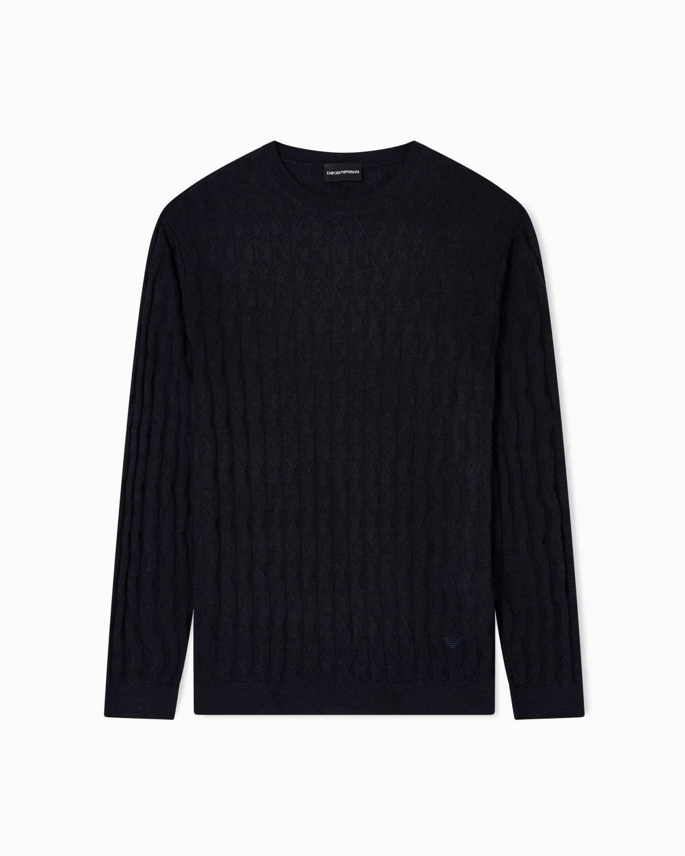 Maglione girocollo realizzato in misto lyocell, una fibra semi-sintetica che si caratterizza per il bassissimo impatto ecologico che ha sull'ambiente: viene prodotta a partire da alberi di eucalipto e si fa apprezzare per la sua grande resistenza, per la sua capacità di assorbire l’umidità, la sua notevole traspirabilità, oltre che per la particolarità di essere un tessuto anti grinze. La trama, particolarmente leggera, in maglia lavorata a punto fantasia mostra un esclusivo motivo a rilievo.
