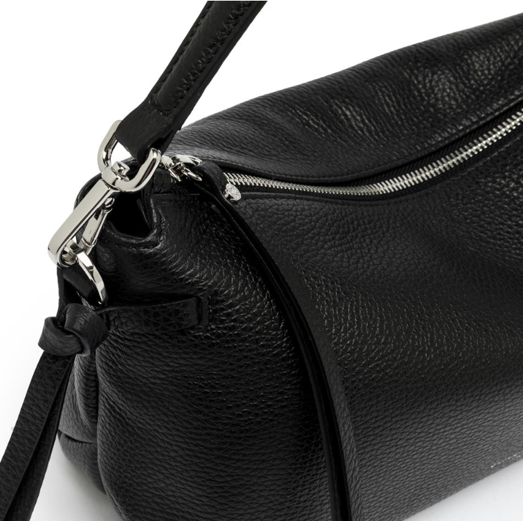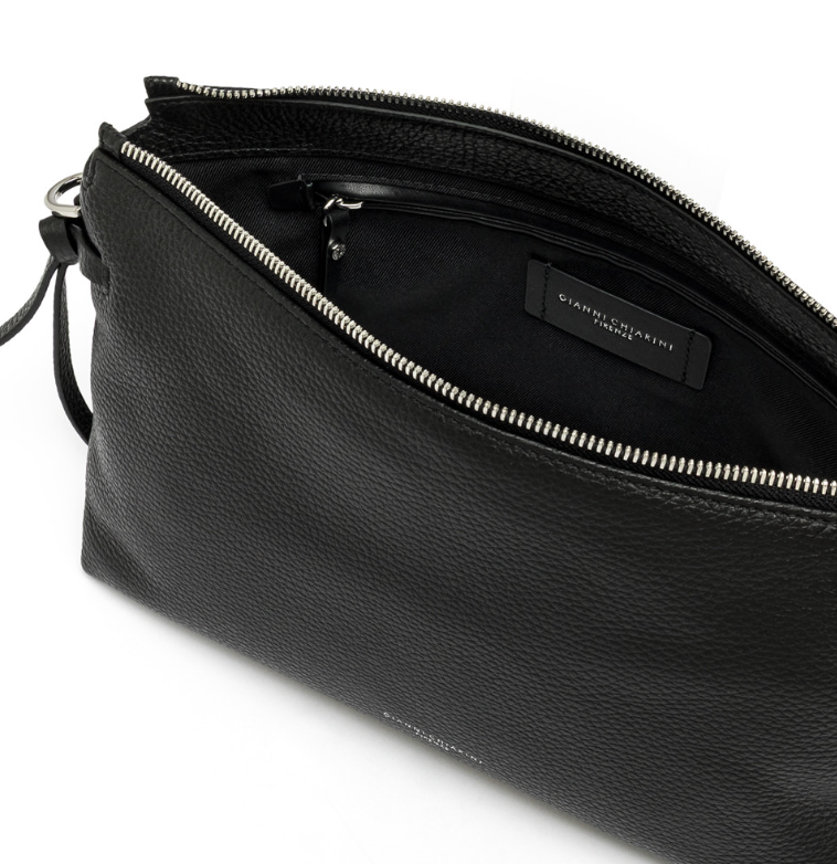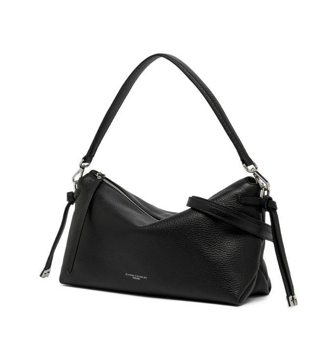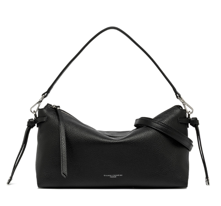 Brina by Gianni Chiarini Firenze è una borsa in pelle martellata con linee minimal e squadrate. I dettagli annodati e i componenti in metallo aggiungono un tocco luminoso. È dotata di un manico in pelle per essere indossata comodamente a spalla e di una tracolla regolabile e removibile, ideale per un'opzione crossbody. Dimensioni: 23,5x15x10,5 cm.
