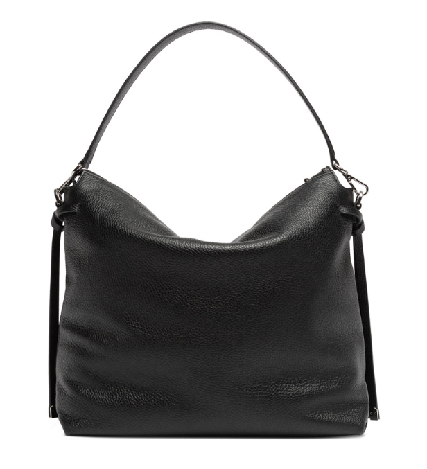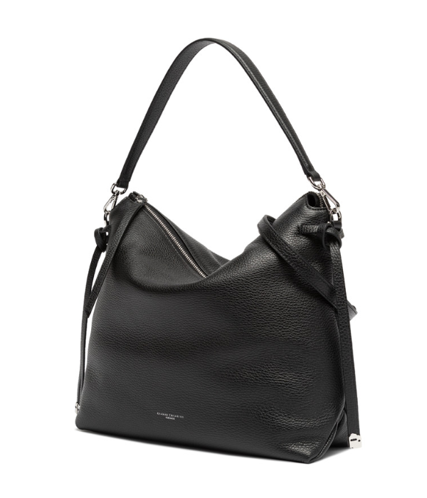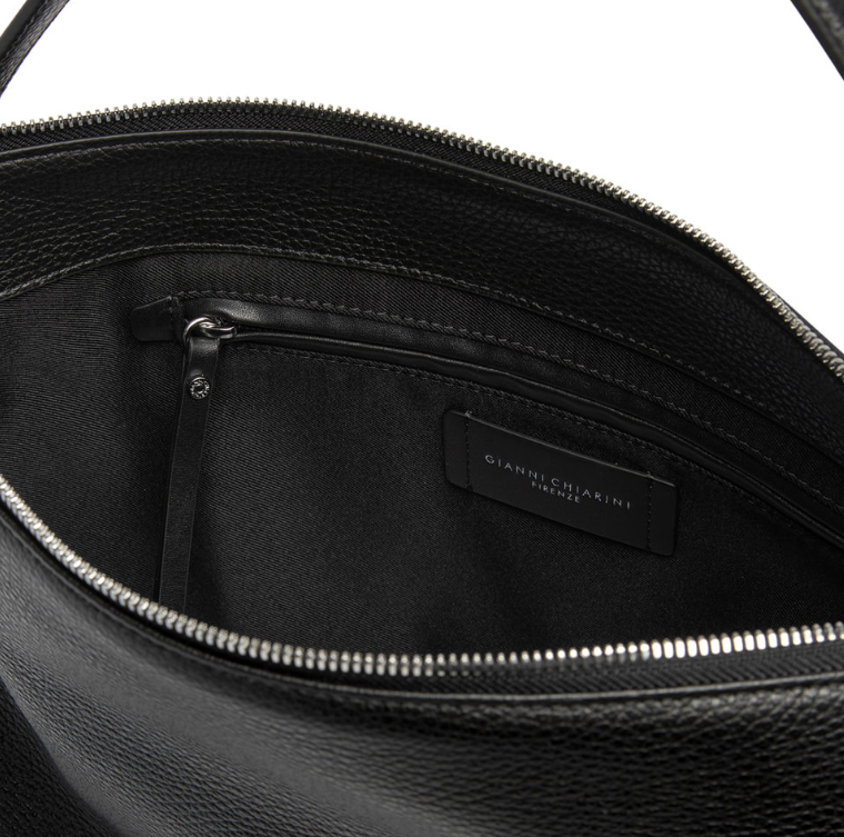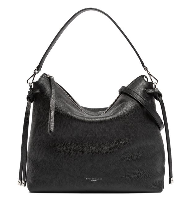 Brina by Gianni Chiarini Firenze è una borsa in pelle martellata con linee minimal e squadrate. I dettagli annodati e i componenti in metallo aggiungono un tocco luminoso. È dotata di un manico in pelle per essere indossata comodamente a spalla e di una tracolla regolabile e removibile, ideale per un'opzione crossbody. La chiusura superiore con zip garantisce sicurezza e praticità. Dimensioni: 32x28x11 cm.
