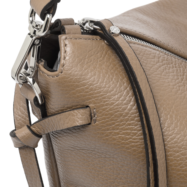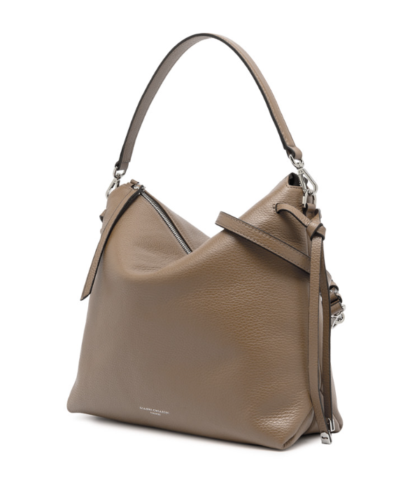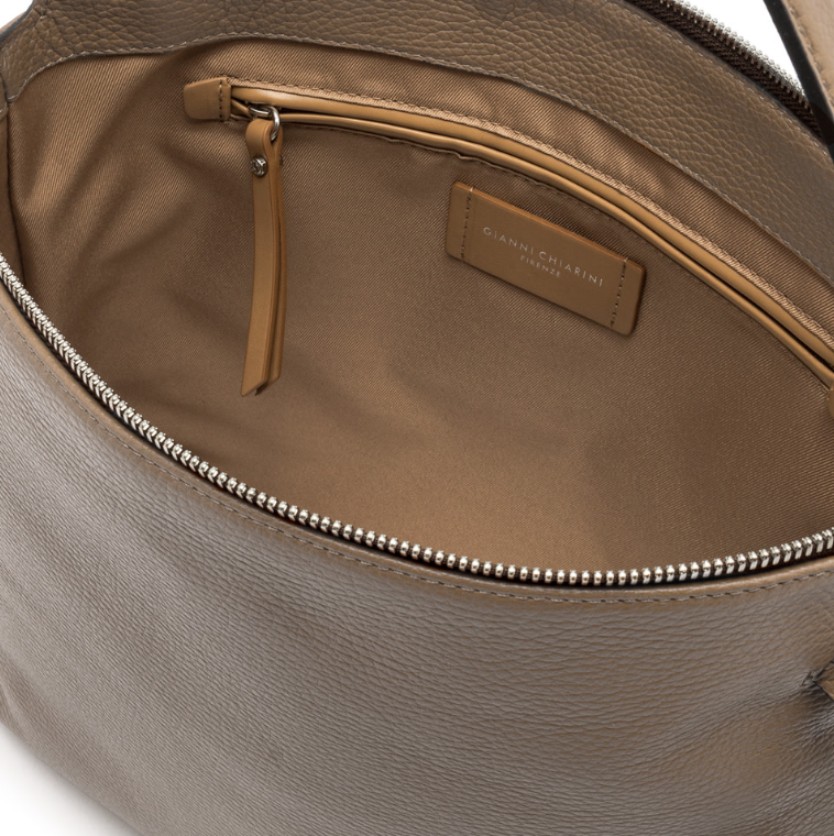 Brina by Gianni Chiarini Firenze è una borsa in pelle martellata con linee minimal e squadrate. I dettagli annodati e i componenti in metallo aggiungono un tocco luminoso. È dotata di un manico in pelle per essere indossata comodamente a spalla e di una tracolla regolabile e removibile, ideale per un'opzione crossbody. La chiusura superiore con zip garantisce sicurezza e praticità. Dimensioni: 32x28x11 cm.