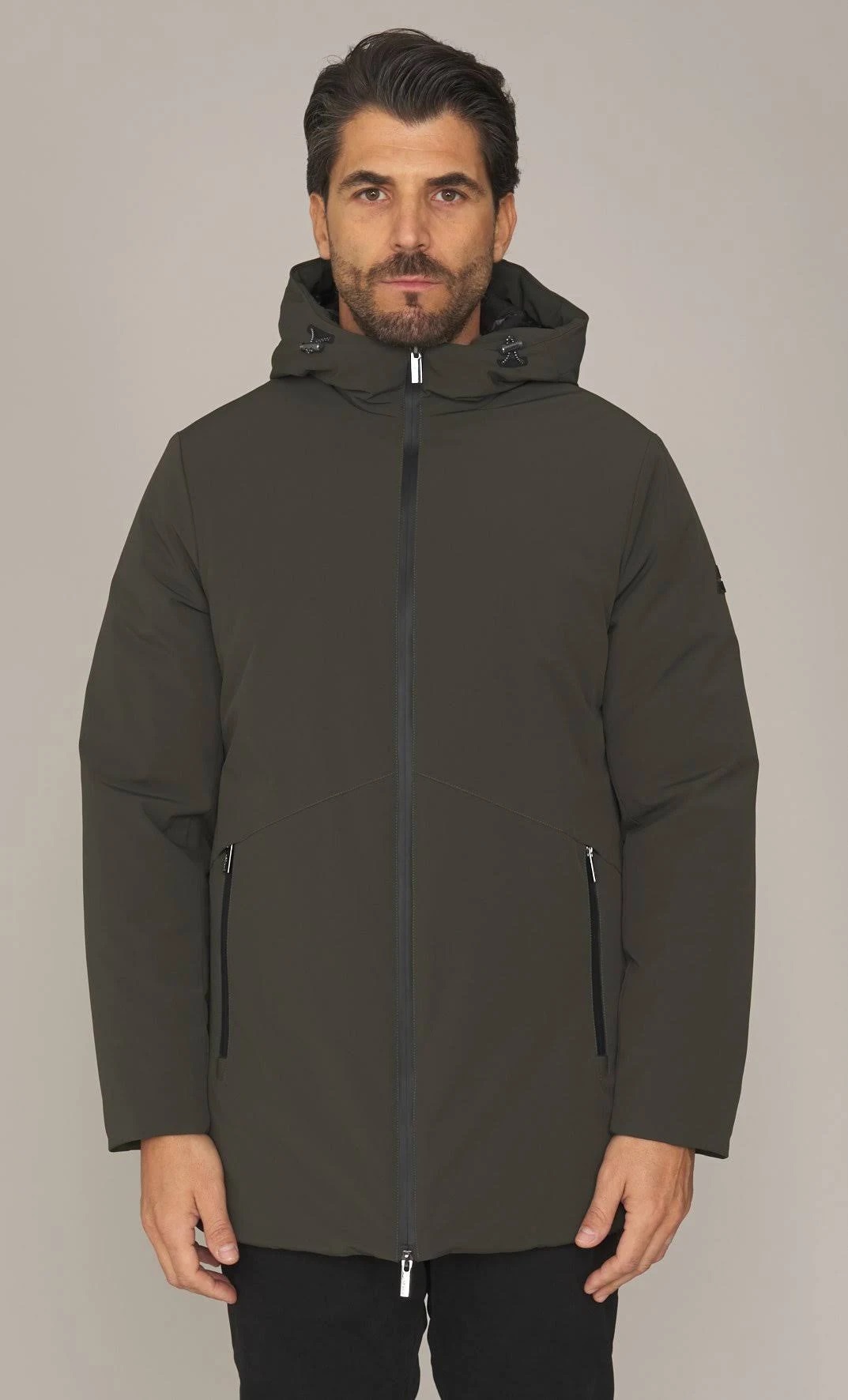Giubbotto in nylon tecnico con cappuccio fisso, dal design minimalista e linee pulite. La chiusura centrale con zip waterproof a doppio cursore assicura protezione e praticità. Dotato di tasche laterali con zip termosaldate, è pensato per garantire massimo comfort nelle giornate fredde e piovose.