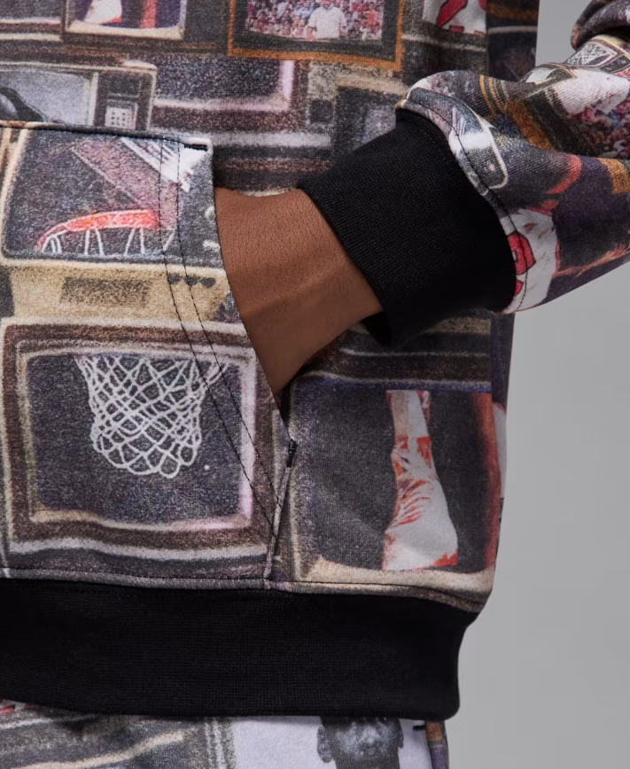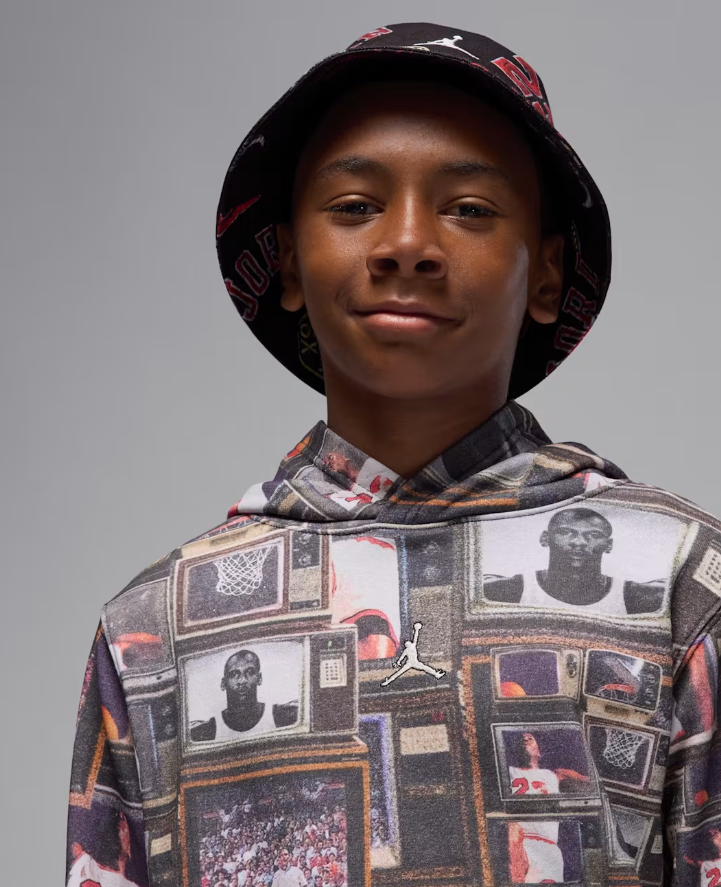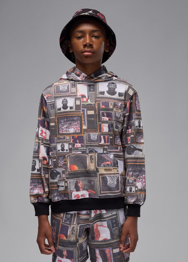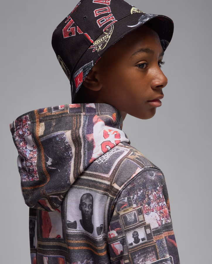 Indossa la storia visiva del nostro omonimo, la leggenda del basket Michael Jordan, con questa ampia felpa con cappuccio, realizzata in morbido tessuto French Terry di cotone e poliestere. Presenta spalle scese che assicurano una vestibilità rilassata e una tasca a marsupio per riporre piccoli oggetti o tenere le mani al caldo.