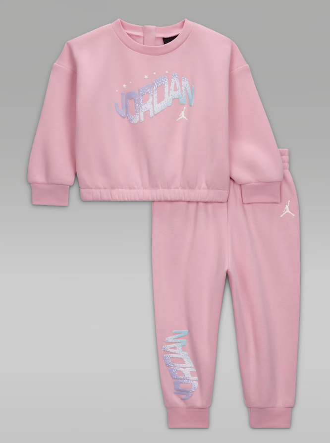 Vesti i tuoi piccoli futuri ballerini con questo completo in due pezzi, realizzato in pile di cotone misto, liscio all'esterno e morbido all'interno. La maglia girocollo presenta chiusure a nastro a scatto sulla scollatura posteriore per una facile indossabilità, spalle scese che rilassano la vestibilità e un orlo a palloncino elasticizzato. I pantaloni coordinati hanno una cintura elastica per una vestibilità comoda e gambe affusolate per una sensazione di comfort e sicurezza che mette in risalto le Jordan del tuo bambino.