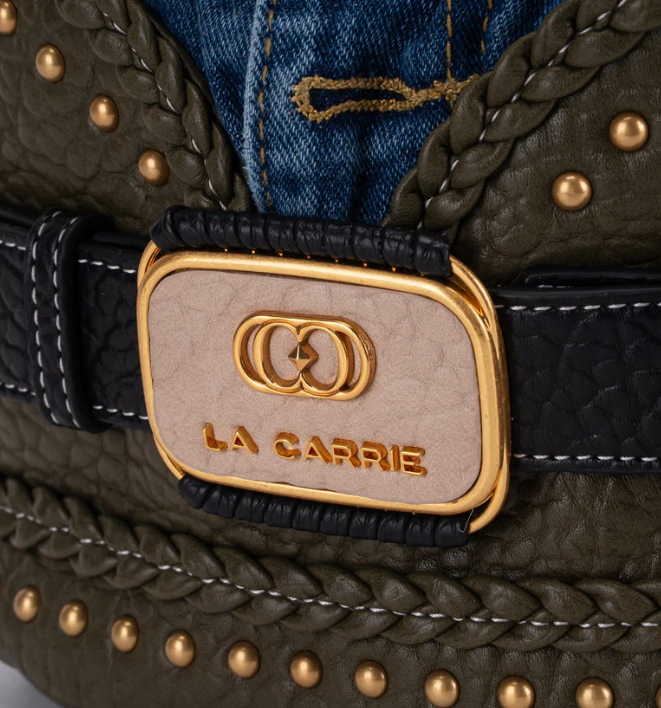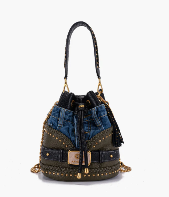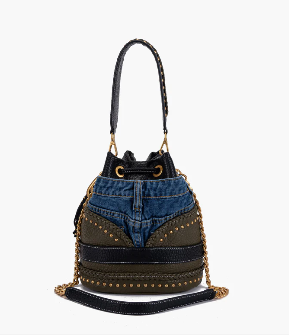 Secchiello multi materiale in jeans ed ecopelle martellata, con borchie dorate e manico e tracolla rimovibile