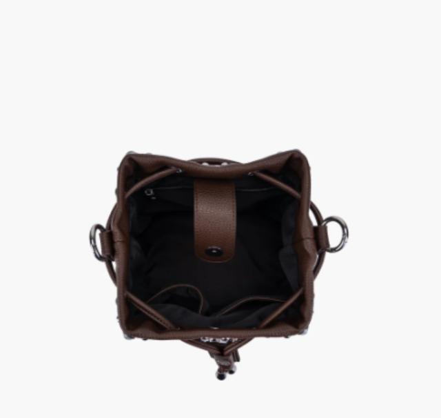 Secchiello in ecopelle martellata con applicazioni di borchie e pietre dure con cabochon; manico e tracolla rimovibili