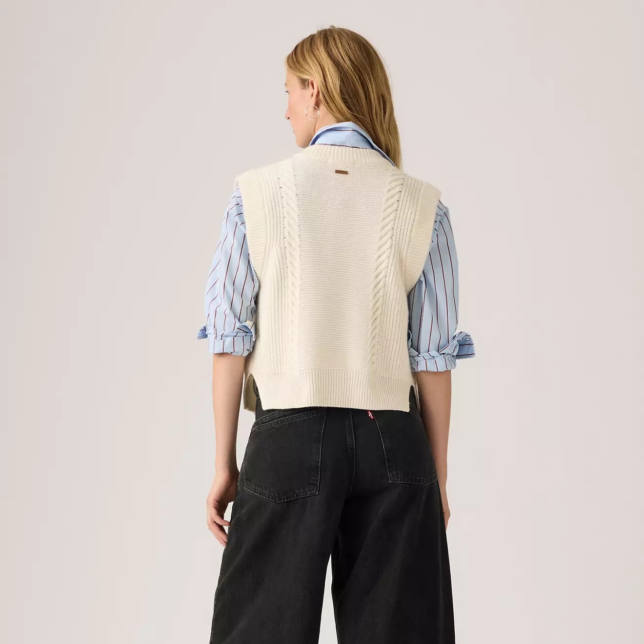 Il gilet a trecce comodissimo per eccellenza. La nostra felpa smanicata Ines a trecce presenta una scollatura a girocollo, bordi a costine e bottoni sul davanti.