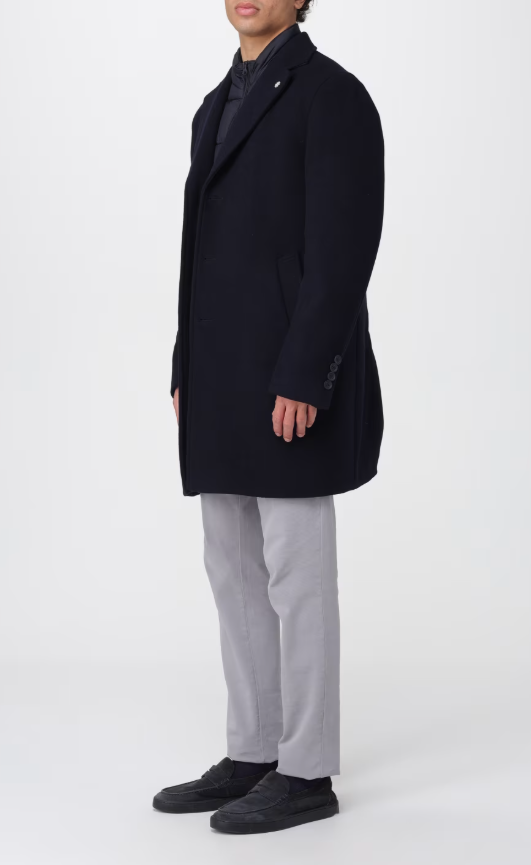Cappotto da uomo Manuel Ritz realizzato in misto lana di alta qualità, perfetto per un look raffinato e contemporaneo. Il design unisce eleganza e funzionalità, con chiusura frontale a tre bottoni, revers classici e tasche laterali inclinate a filetto.