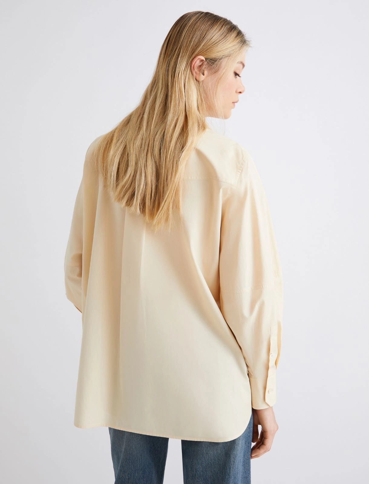 Sofisticato quotidiano, con la camicia in popeline di cotone dalle linee oversize. La cravatta sagomata con fiore tessile si stringe al collo, in vita o al polso, per uno stile da personalizzare a piacere.