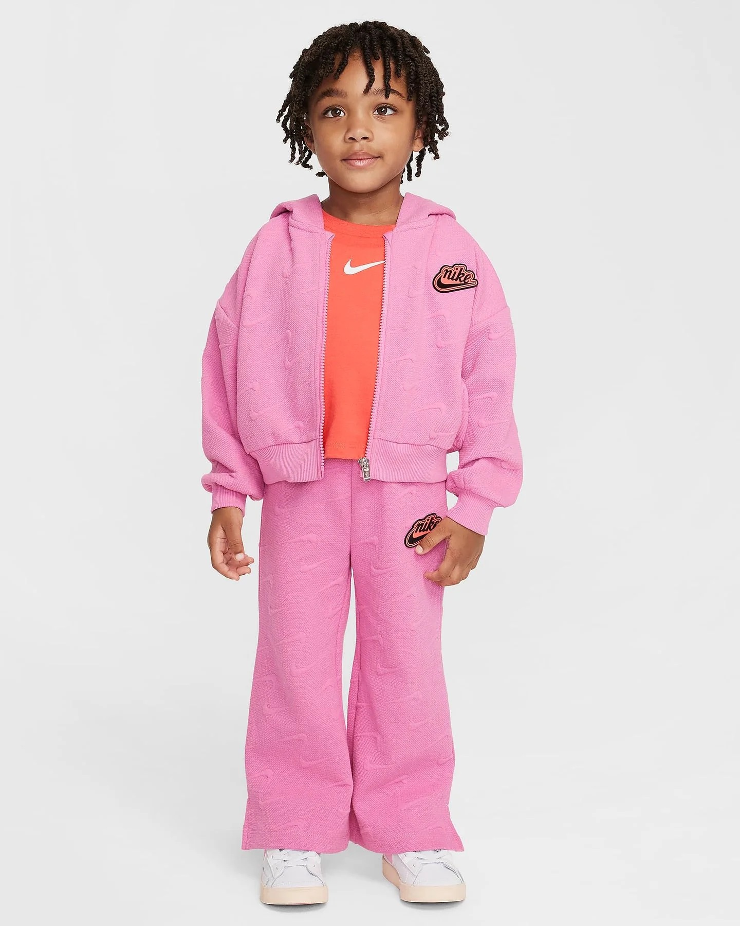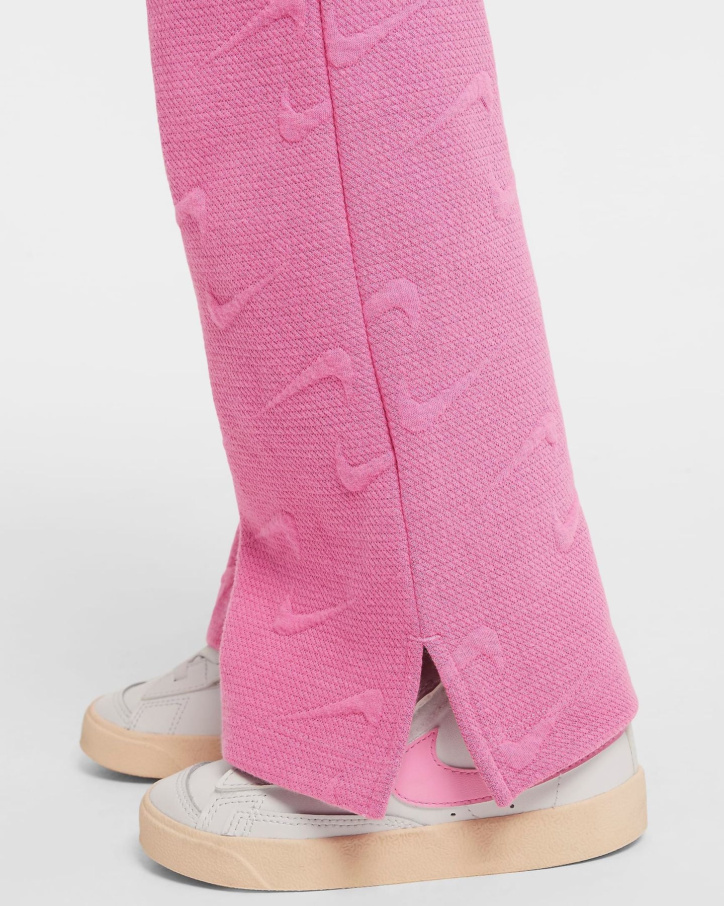 Questi pantaloni sono realizzati in tessuto di cotone/poliestere con un motivo Swoosh lavorato a maglia su tutta la superficie che non mancherà di fare colpo. La cintura elastica a coste offre una vestibilità comoda e le gambe larghe hanno aperture sui polsini esterni in modo che i più piccoli possano giocare e muoversi liberamente. Abbinali a uno qualsiasi dei top della collezione New Impressions per un look coordinato.