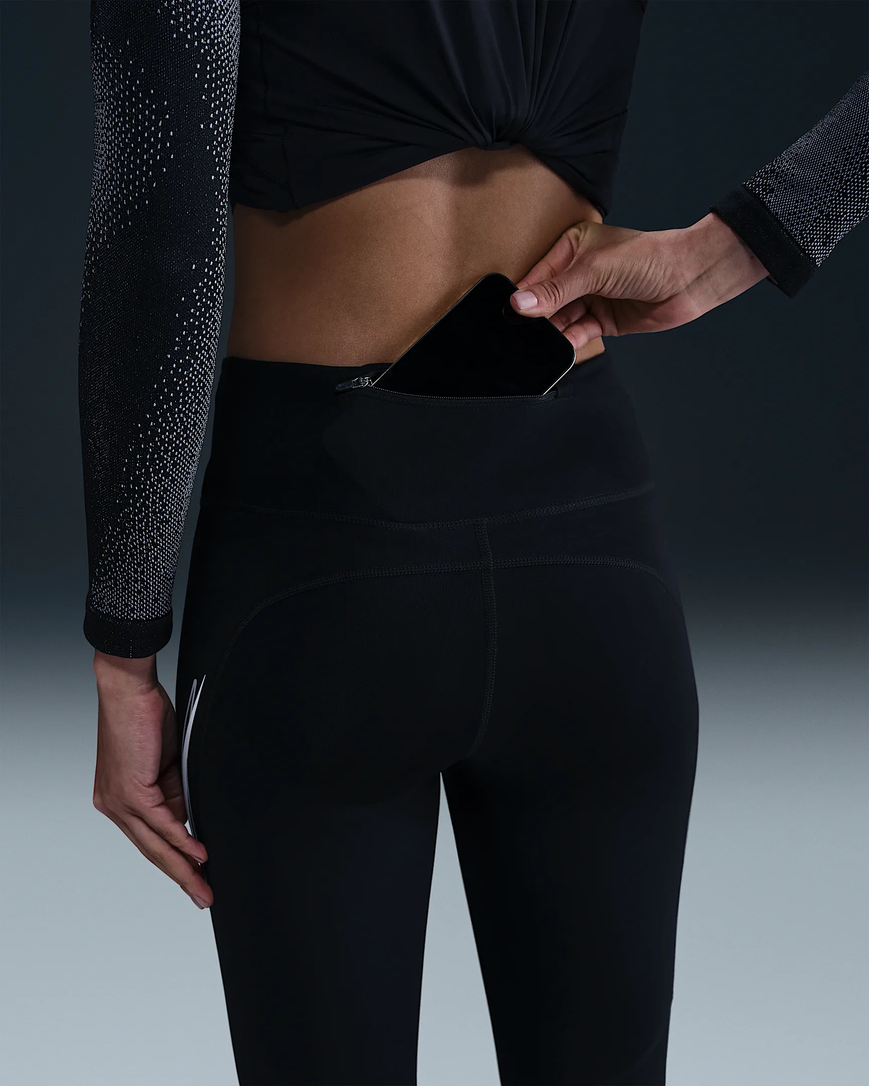 La tasca laterale aperta e la tasca posteriore con zip sono adatte alla maggior parte degli smartphone.