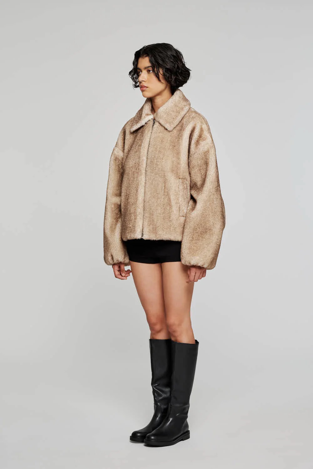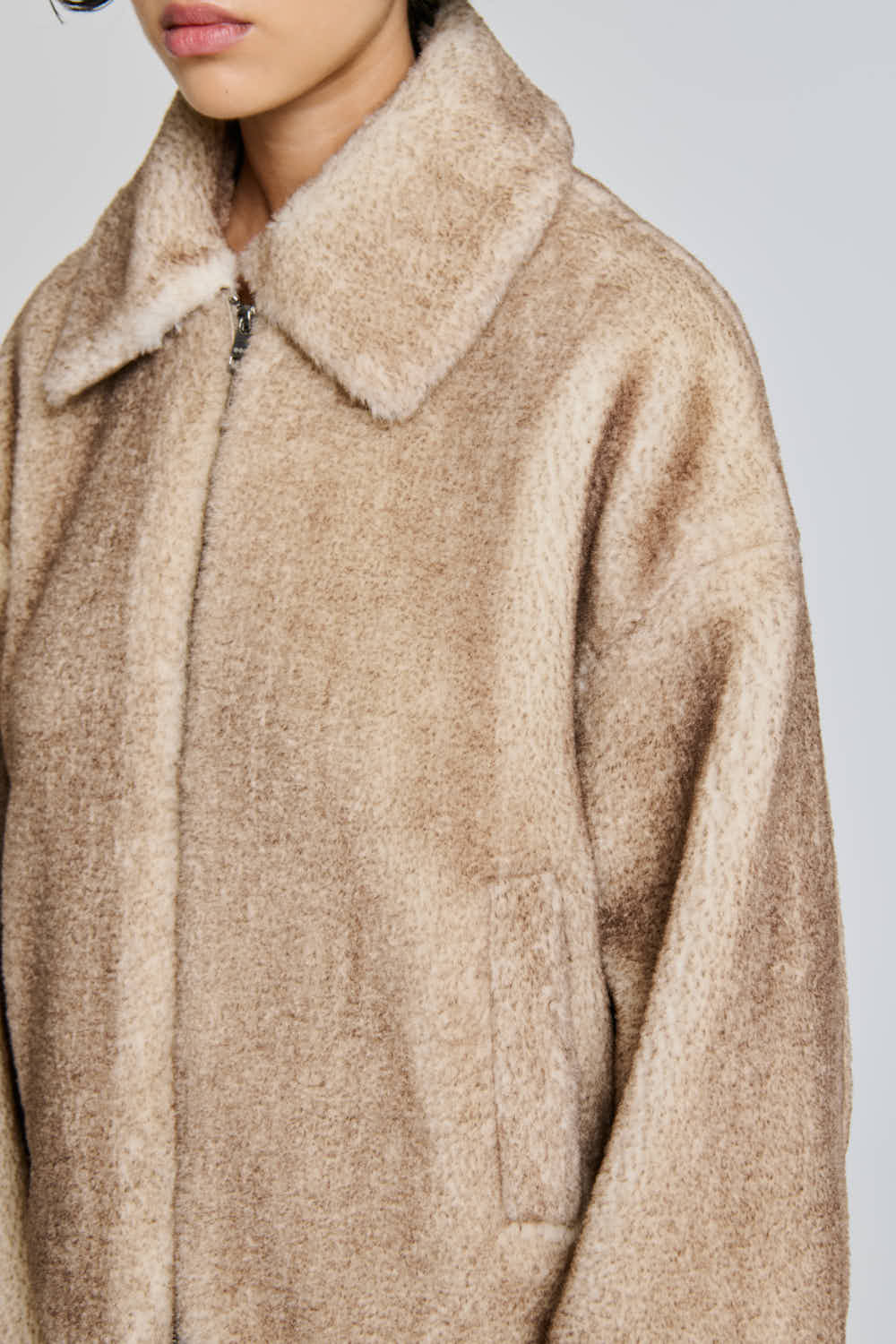 Giacca corta con volume morbido e texture soffice. Realizzata in eco-pelliccia dal finish luminoso, il design essenziale è completato da un collo ampio e strutturato, tasche laterali inserite in cucitura e chiusura centrale con zip a vista.