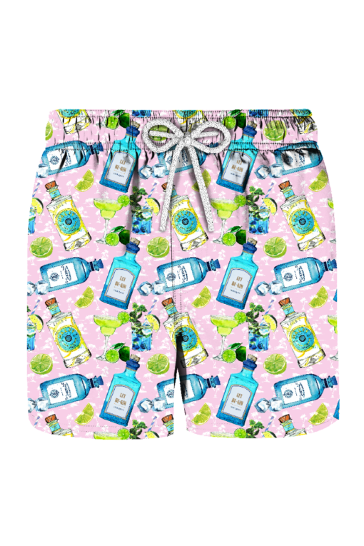 Costume da bagno in light pink con stampa lime e gin. Dotato di coulisse e tasche laterali.