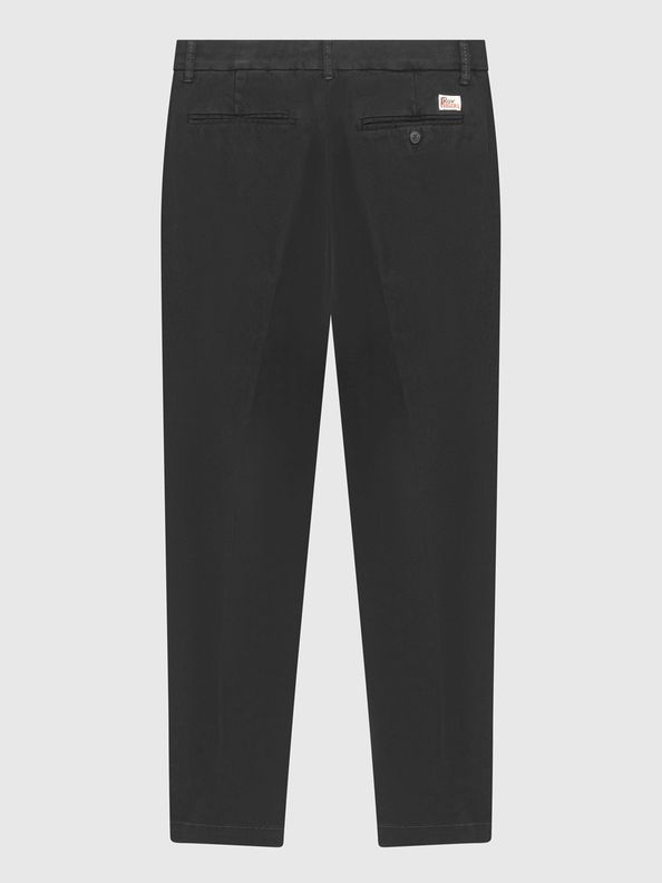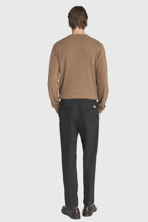 Due tasche oblique sul davanti e due tasche a filetto sul retro con bottone.