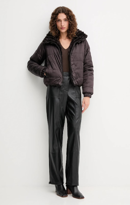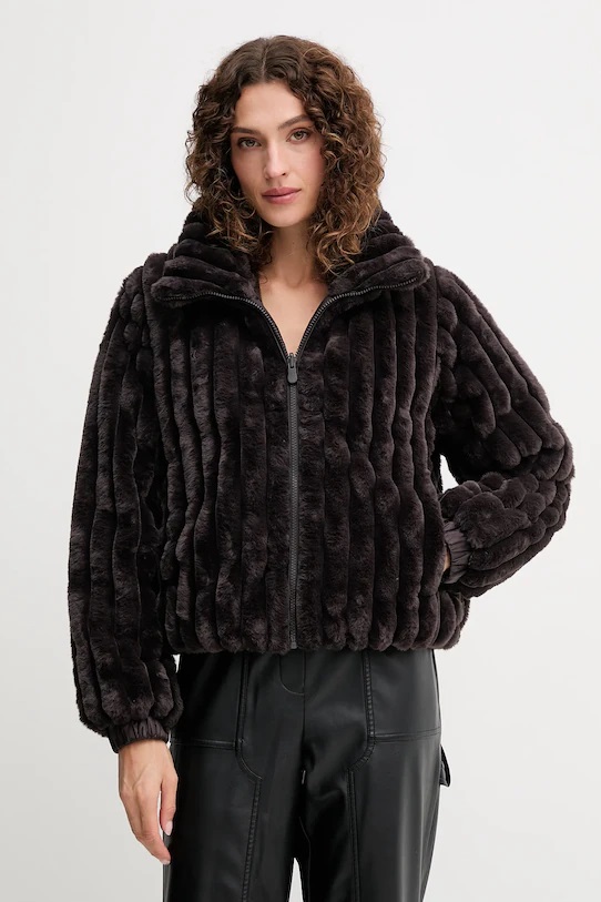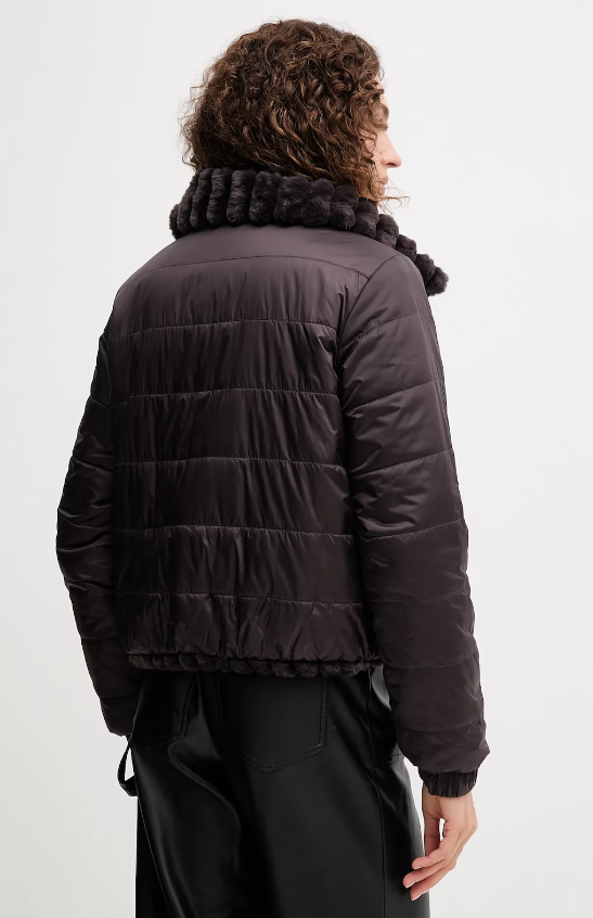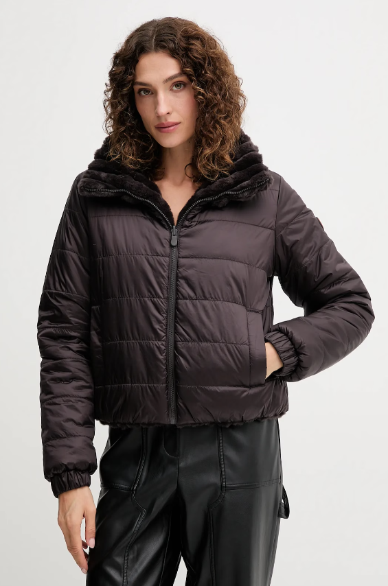 La giacca donna con collo alto e' reversibile e unisce praticita' e stile in un solo capo: un lato trapuntato per un look più tecnico, l’altro in morbida pelliccia sintetica. Rifinita con bordi elasticizzati su fondo e polsi, ha zip centrale con cursore reversibile e tiretto personalizzato. Tasche basse su entrambi i lati e logo tondo coordinato completano il design.