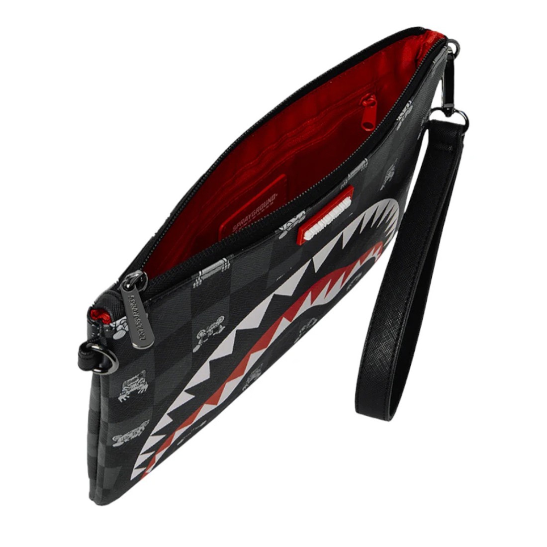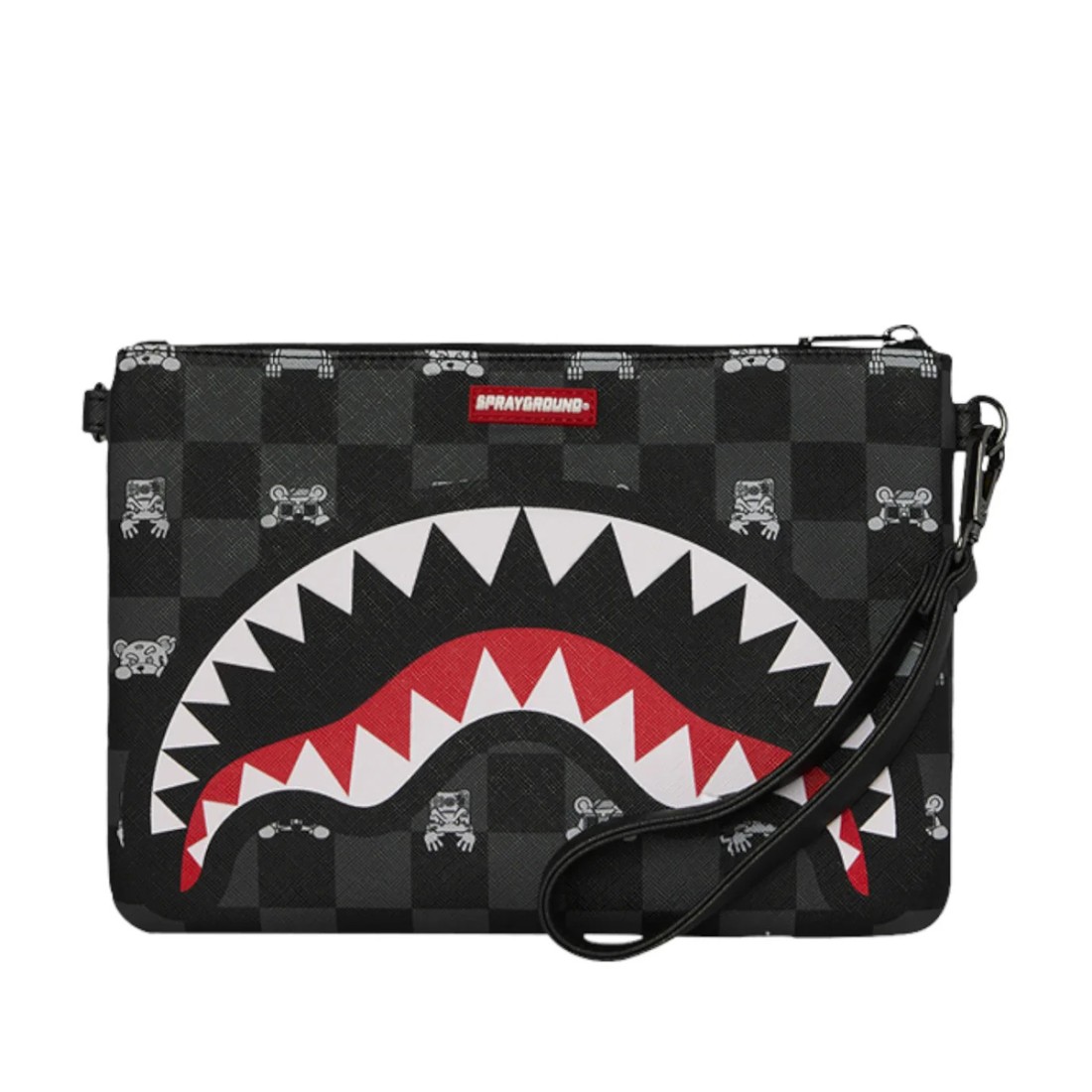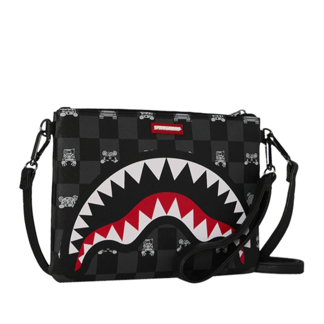 Pochette Sprayground - ''Gray Peeking Character Check Crossbody'' stile street raffinato con stampa scacchi nera e iconica bocca shark effetto graffito. Pochette compatta Sprayground grigia con motivo a quadri e dettagli a vista, dal design iconico e streetwear, pensata per unire praticità e stile urbano. Realizzata in PVC resistente e facile da pulire, è ideale per contenere gli oggetti essenziali durante le uscite quotidiane o le serate, mantenendo un look moderno e distintivo.