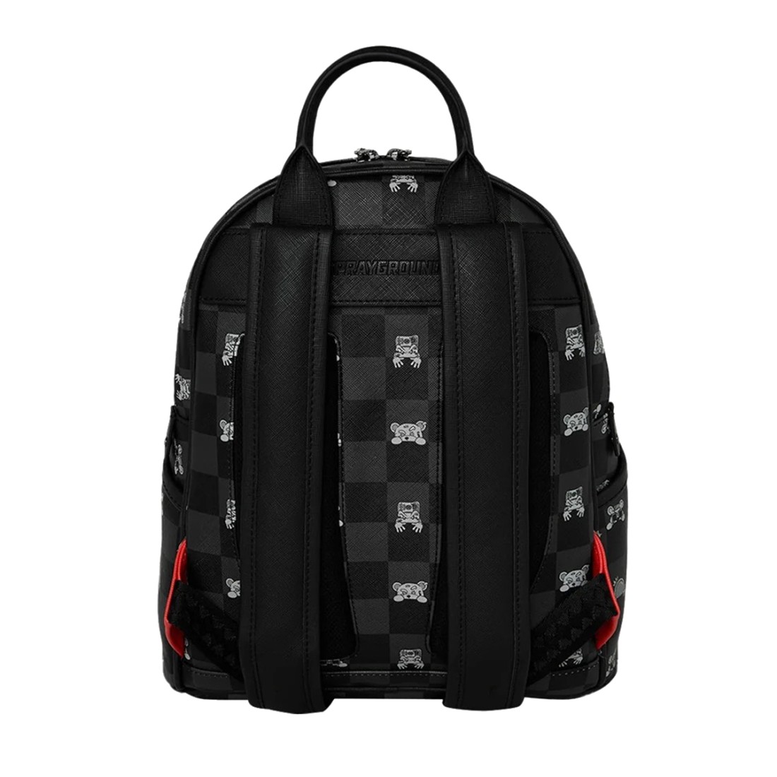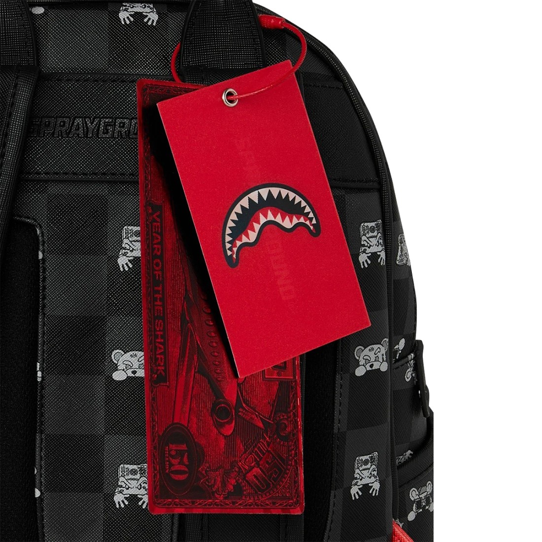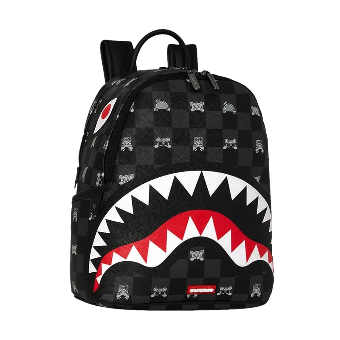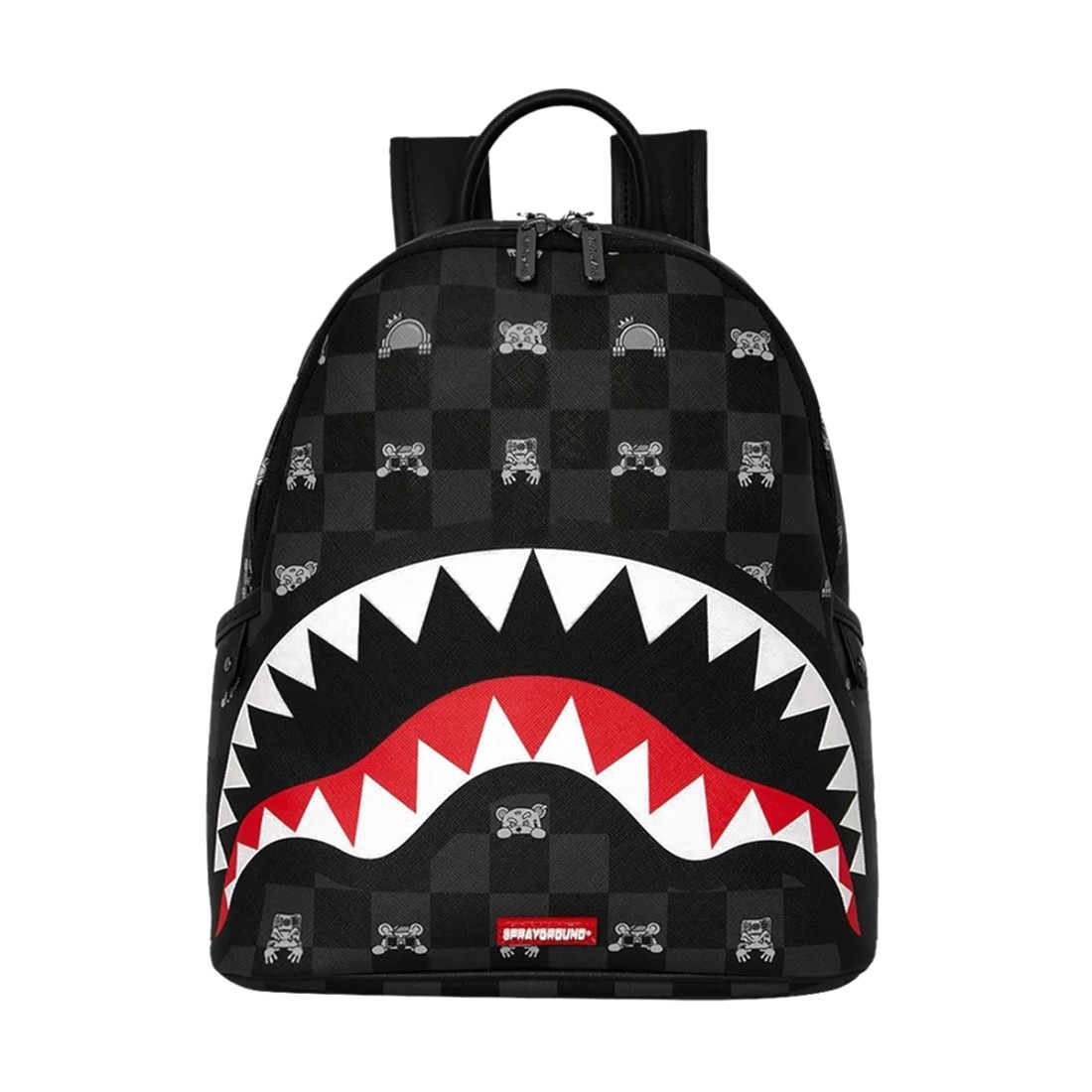 Zaino Sprayground ''Gray Peeking Character Check '' look urbano con stampa a scacchi nera e bocca shark effetto graffito. Design compatto ma spazioso, ideale per tutti i giorni. Realizzato in materiale resistente e waterproof, perfetto per scuola, lavoro o lifestyle metropolitano. Stile streetwear autentico. Dimensioni 25cm x 13cm x 30cm