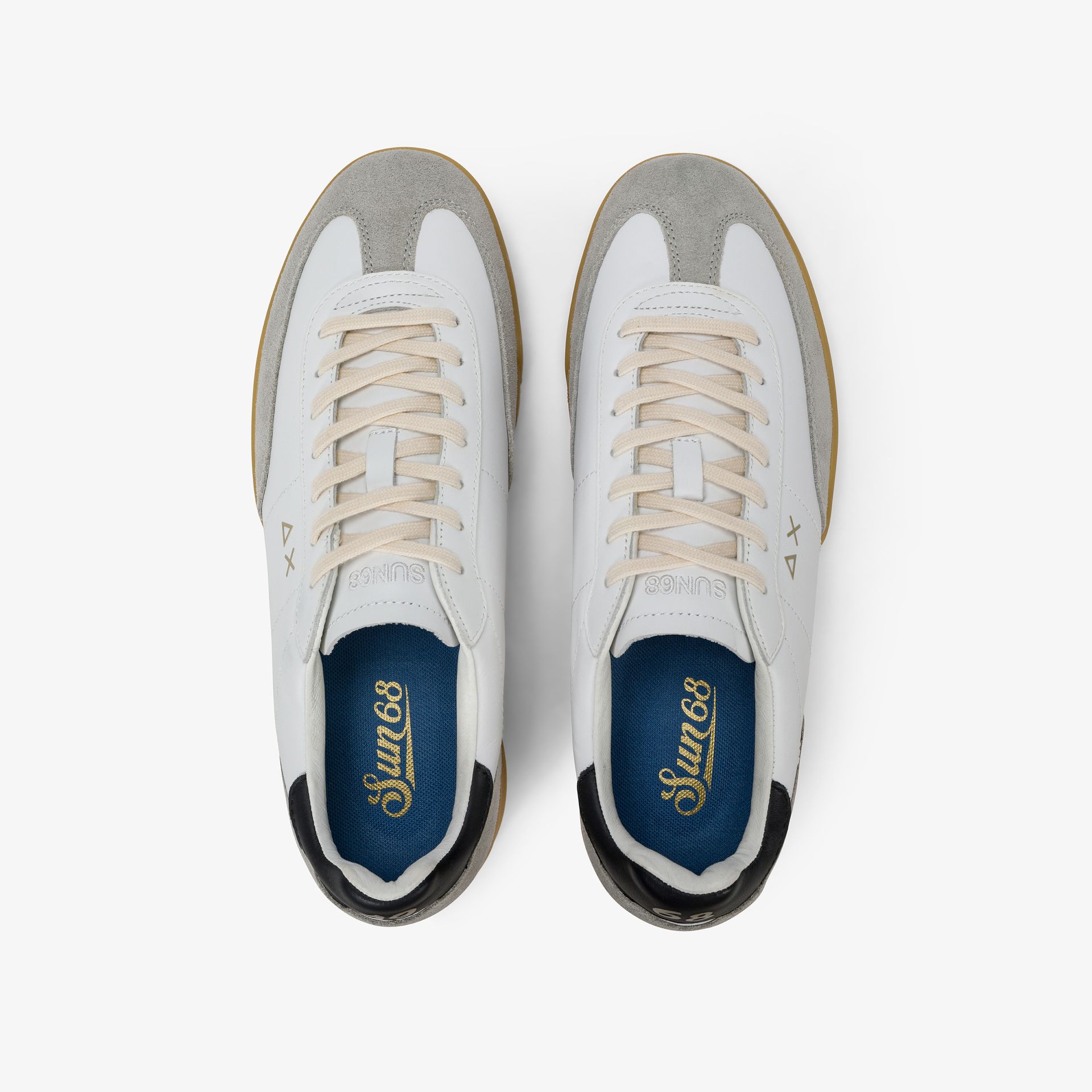 Ispirata alla classica scarpa da bowling, la sneaker California Sun reinventa lo stile vintage con un tocco moderno. La suola in gomma dalla tonalità naturale aggiunge un accento iconico, mentre la tomaia in pelle crea una sensazione tattile pregiata. Indossala con i pantaloni e la maglieria d'ispirazione rétro della nuova collezione per un outfit coordinato dal fascino old school.