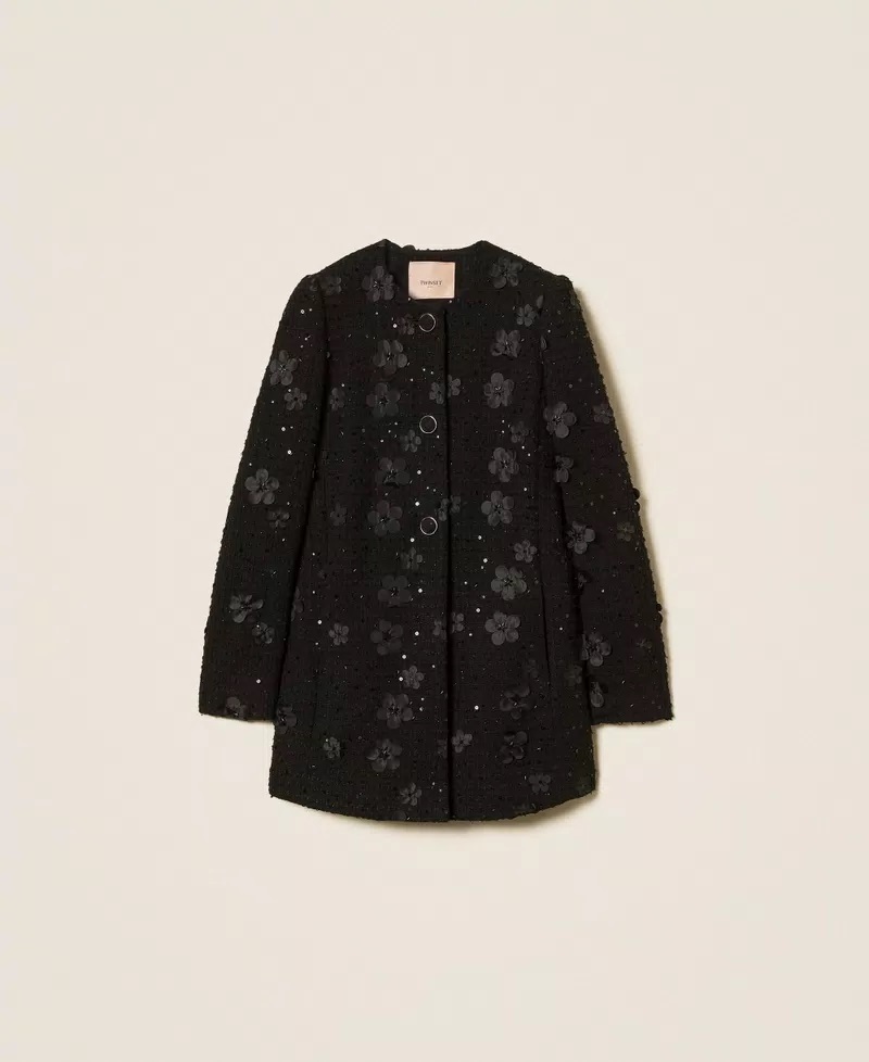 Cappotto in tessuto bouclé con applicazione di fiori e paillettes. Ha collo tondo, chiusura monopetto con bottoni ricoperti, maniche lunghe, tasche inserite nei tagli, fodera, placchetta logo Oval T, linea dritta.