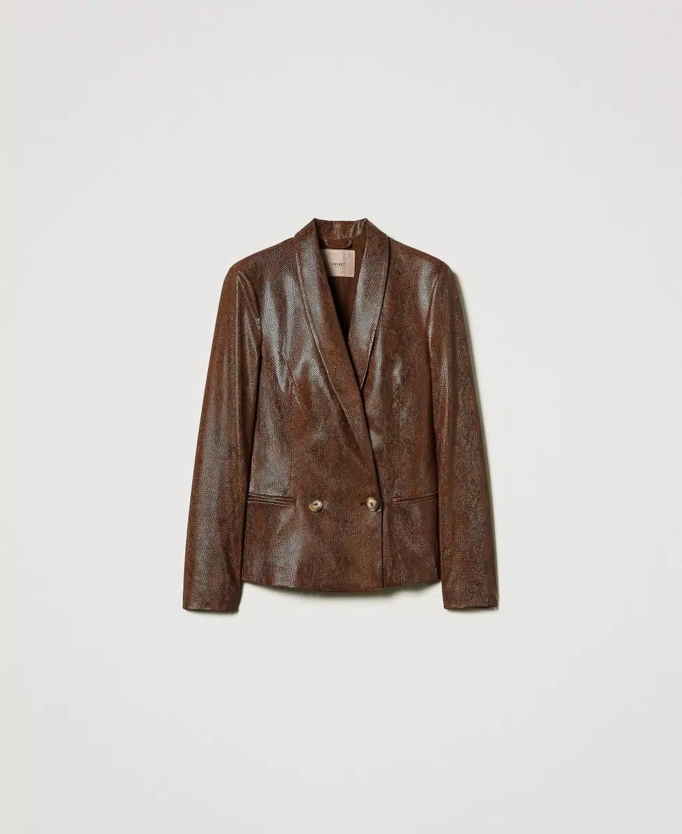 Giacca blazer in tessuto spalmato effetto pelle con stampa a disegno lizard su fondo leggermente embossed. Ha collo con revers, chiusura bassa doppiopetto a due bottoni, maniche lunghe, tasche a doppio filetto, foderata, linea dritta.