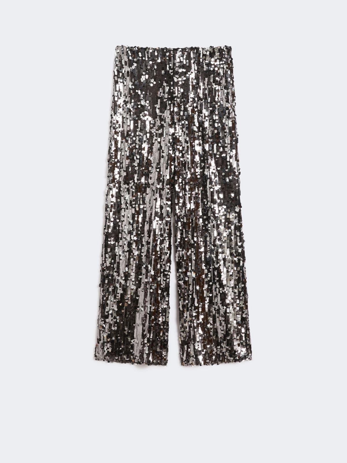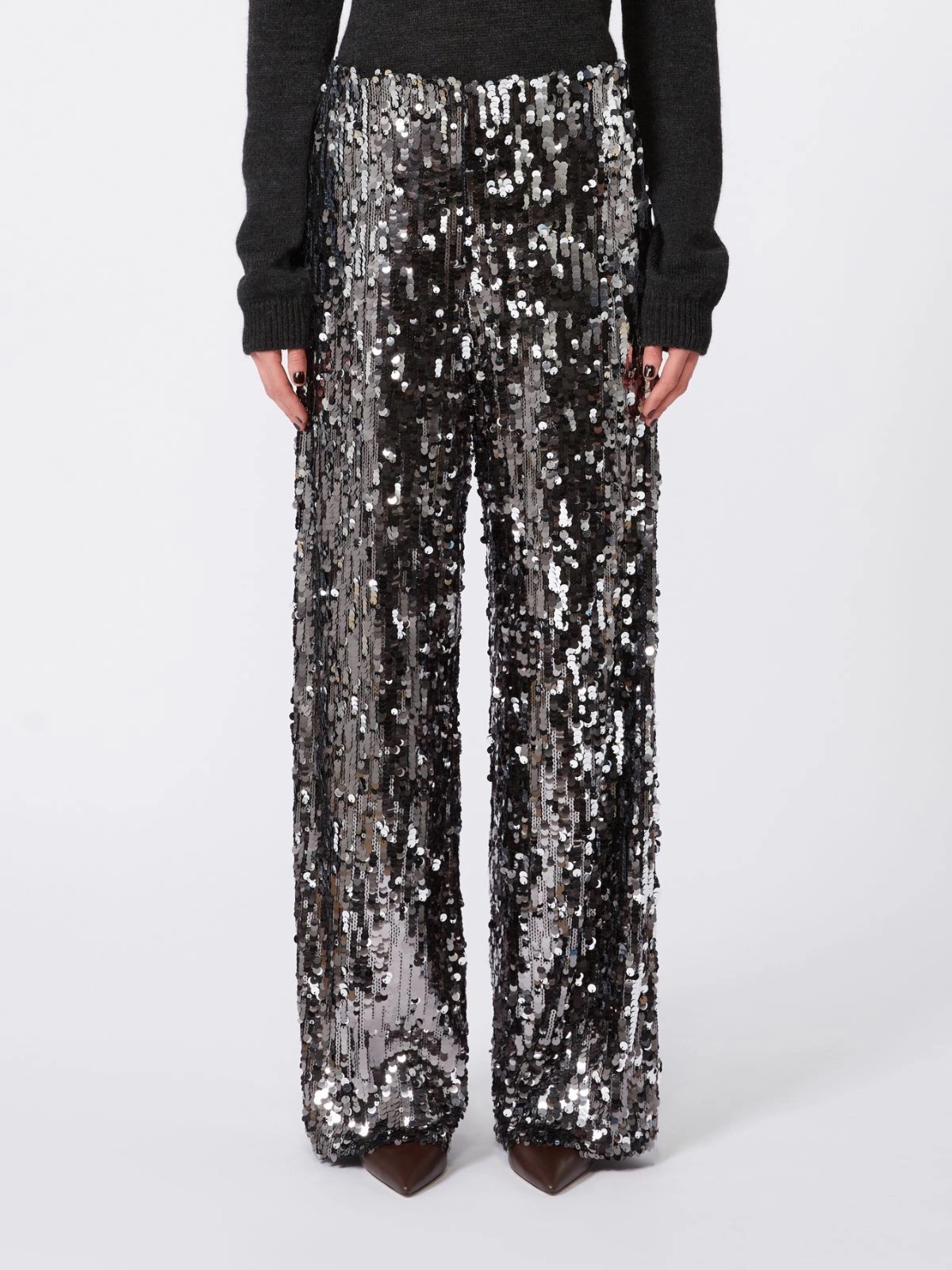 Pantalone dalla silhouette morbida, impreziosito da paillettes di diverse dimensioni ricamate all over, per un gioco di movimento e riflessi specchiati.
