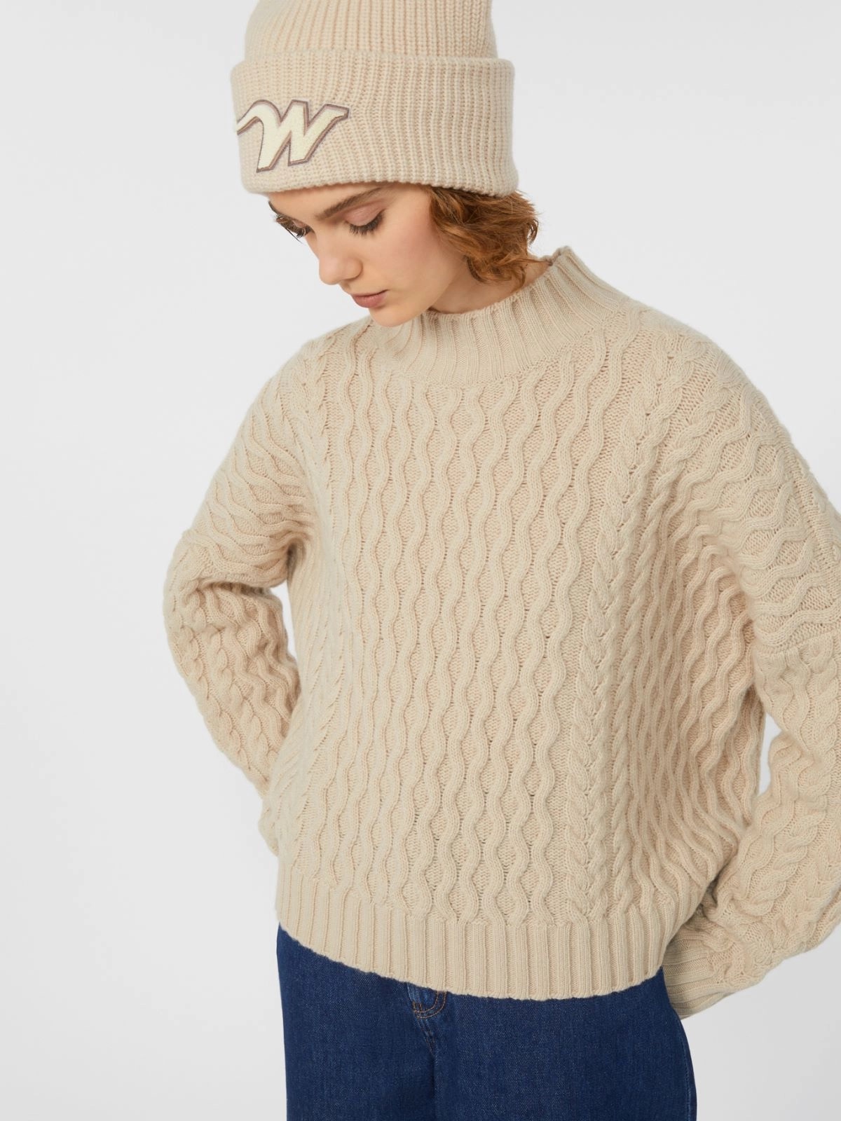 Maglia oversize, caratterizzata da una lavorazione a trecce di ispirazione Aran.