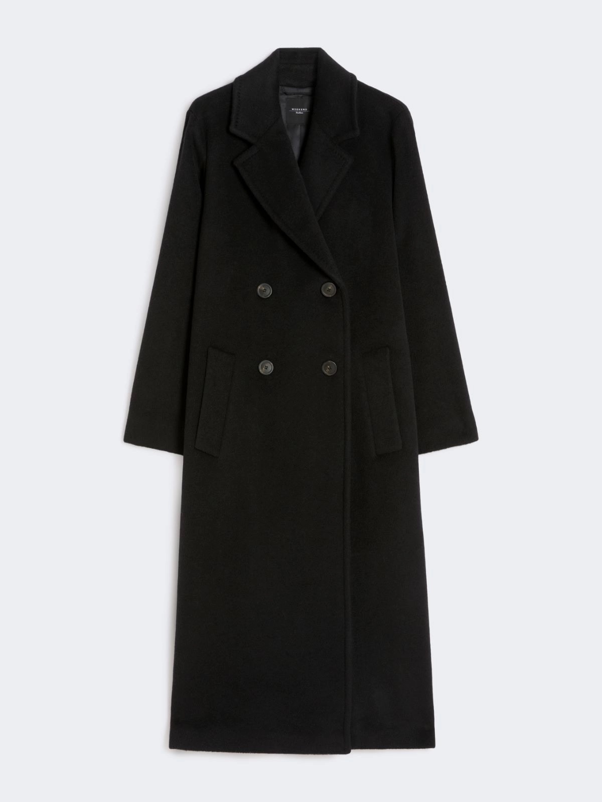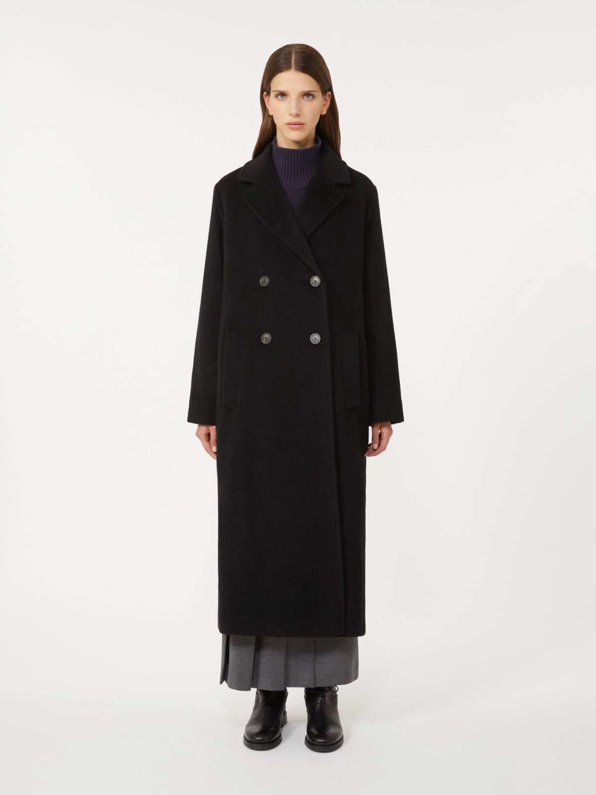 Cappotto lungo doppiopetto, rifinito da dettagli sartoriali.